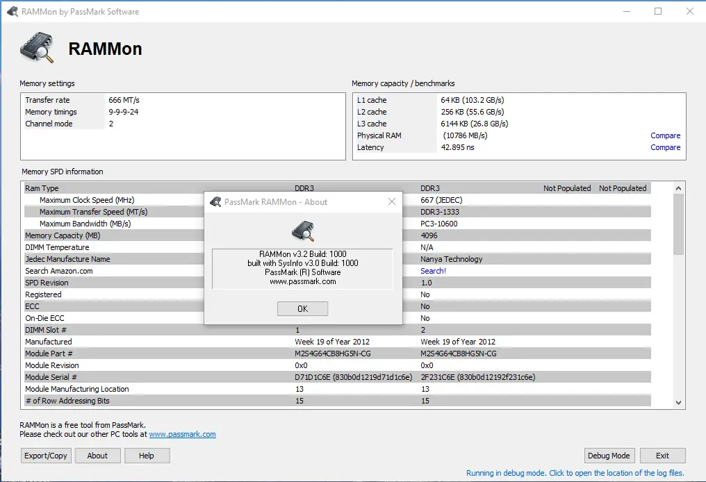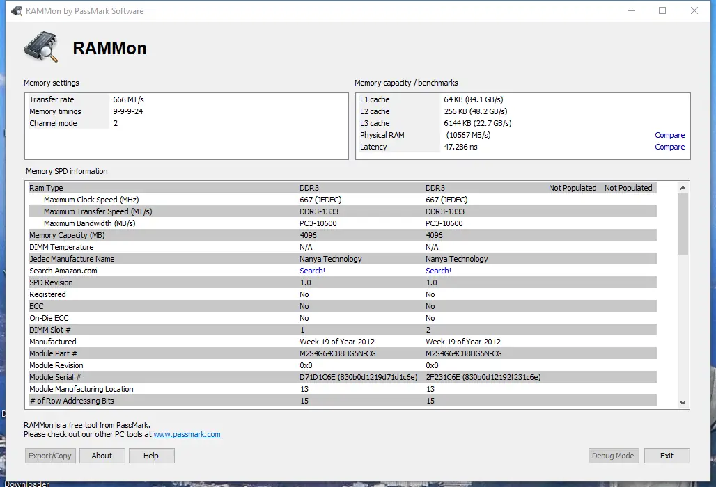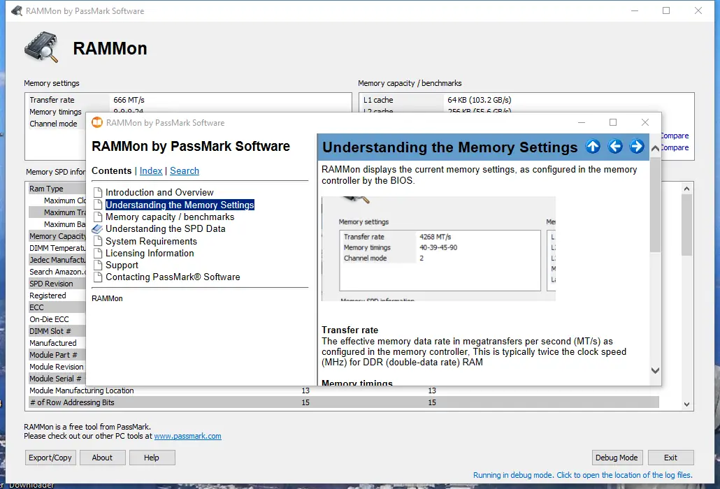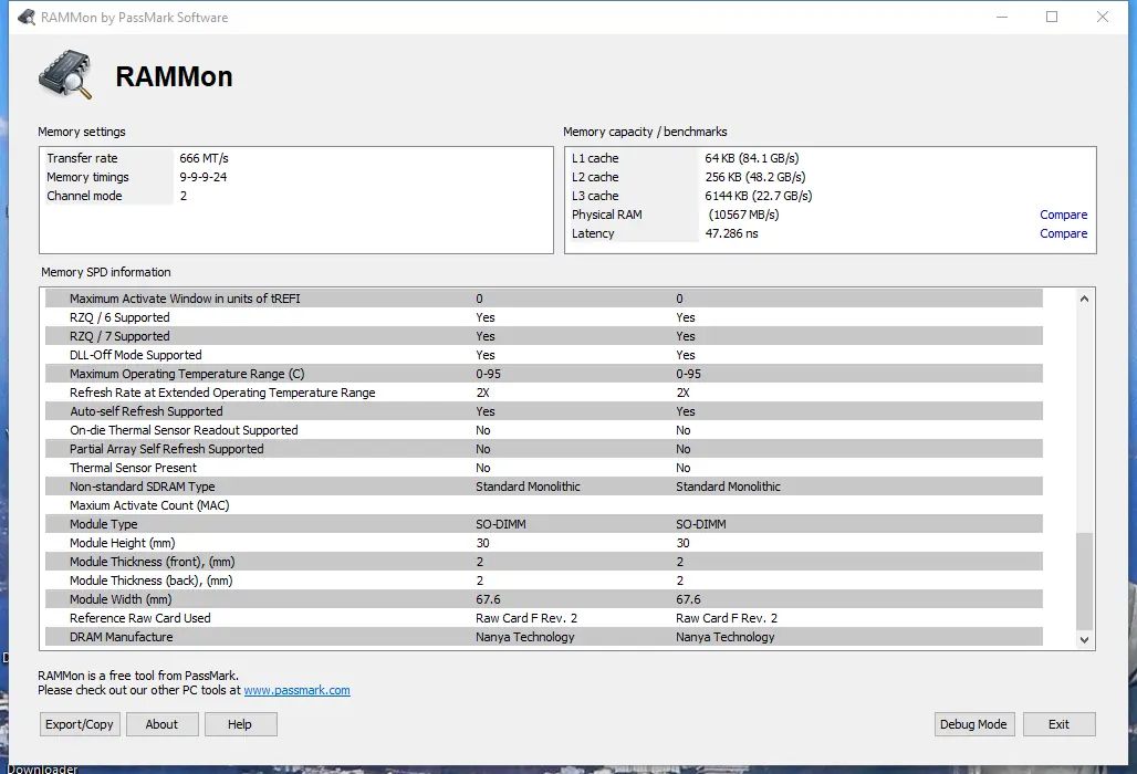 PassMark RAMMon — это компактная утилита для анализа и отображения информации о модулях оперативной памяти с помощью данных SPD. Программа позволяет получить детальные сведения о типе, производителе, частоте, таймингах, объёме и других параметрах ОЗУ. Поддержка различных стандартов памяти делает её универсальным решением для диагностики и мониторинга.