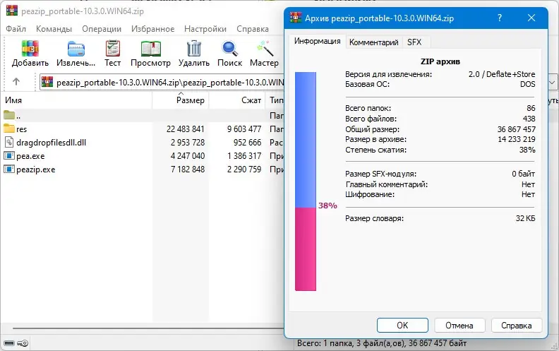PeaZip — бесплатный архиватор с открытым исходным кодом, обеспечивающий работу с широким спектром форматов, шифрование данных, создание многотомных архивов и поддержку портативного режима. Программа совмещает в себе функции графической оболочки и самостоятельного инструмента для упаковки файлов, поддерживая как встроенные, так и внешние движки сжатия. Подходит для пользователей, ценящих безопасность, гибкость и отсутствие зависимости от платного ПО.