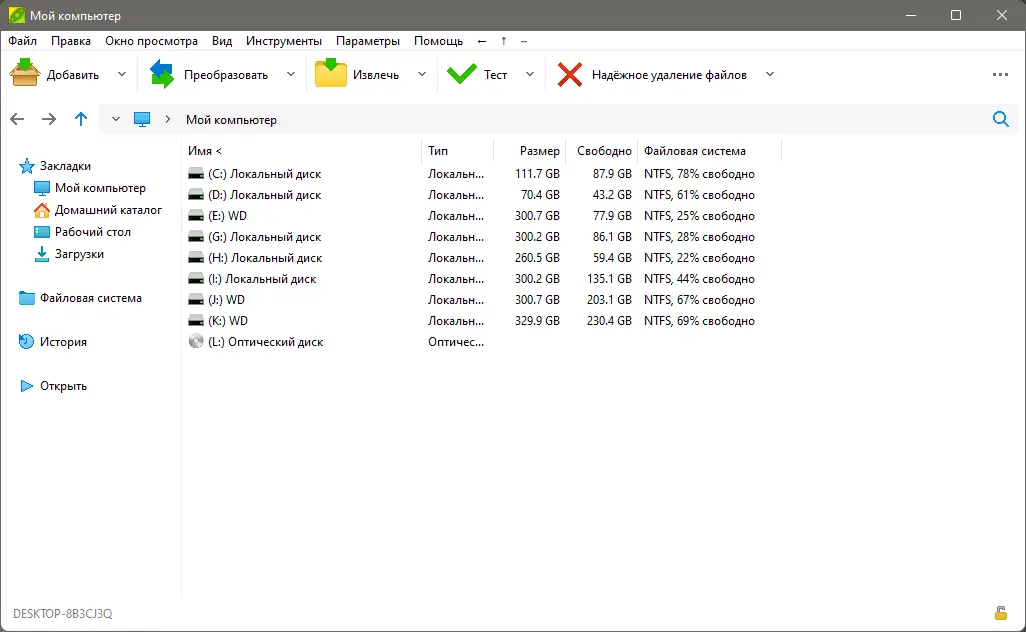 - Работа с закладками для быстрого доступа к часто используемым папкам и архивам.