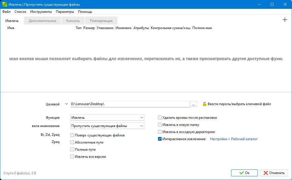 - Поддержка более 200 форматов архивов благодаря интеграции с внешними утилитами