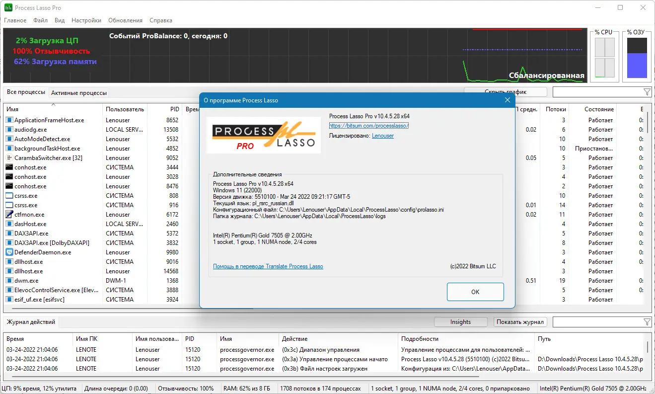 Process Lasso — это инструмент для оптимизации производительности операционной системы путём управления приоритетами запущенных процессов. Программа автоматически выявляет приложения, чрезмерно нагружающие центральный процессор, и корректирует их поведение для повышения отзывчивости системы. Благодаря технологии ProBalance, система остаётся стабильной даже при высокой нагрузке.