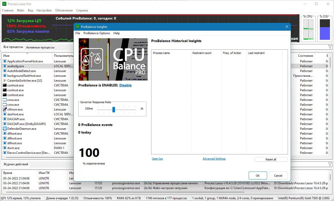 Технология ProBalance обеспечивает плавную работу системы, даже если отдельные процессы начинают потреблять избыточные ресурсы.