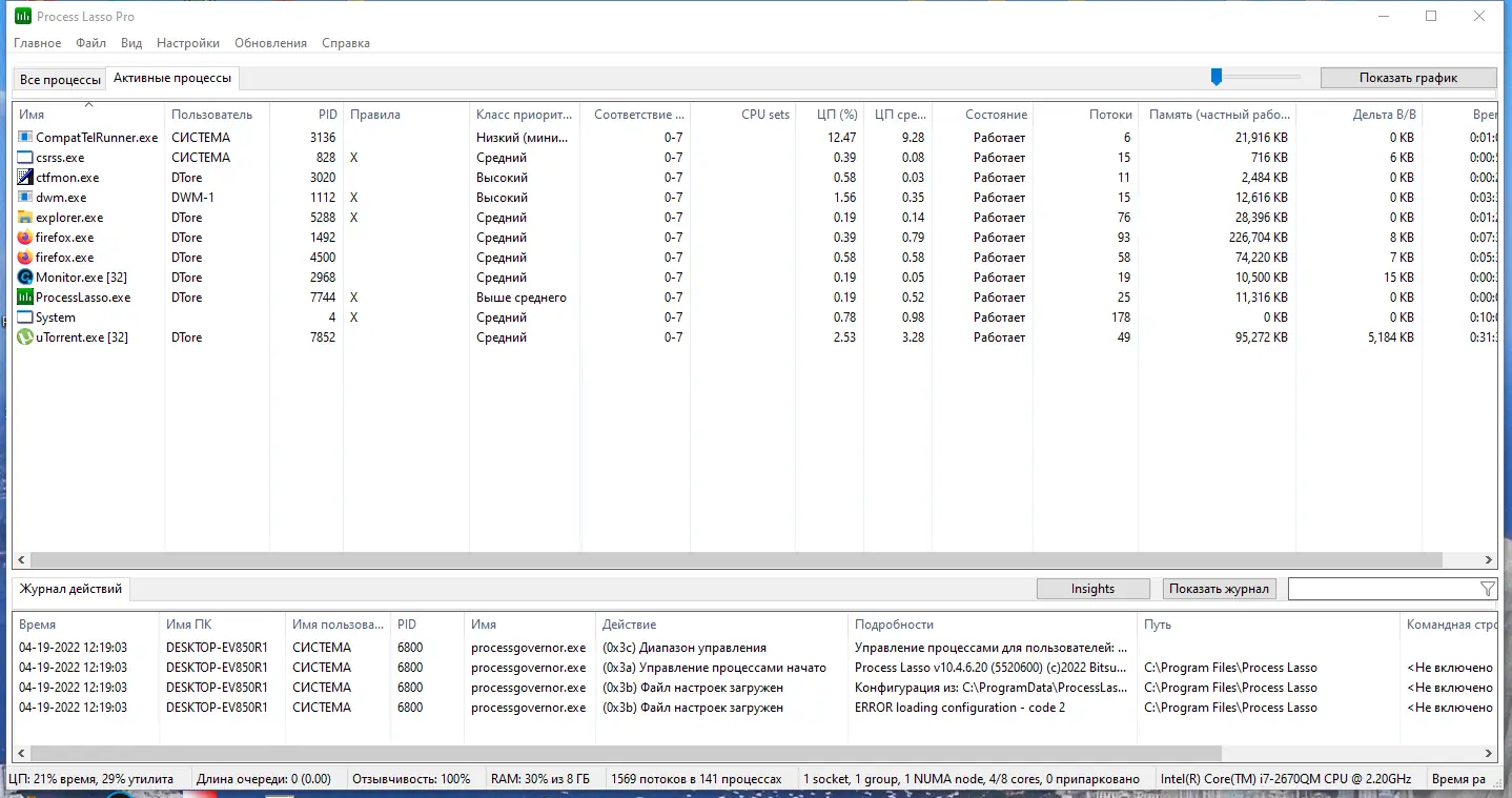 Интерфейс Process Lasso интуитивно понятен и не требует глубоких технических знаний. После запуска отображается список всех активных процессов с возможностью изменения их приоритета через контекстное меню. Пользователь может задать правила по умолчанию для определённых приложений, например, ограничить их использование CPU или запретить запуск. Для более точной настройки доступна функция родства процессов, позволяющая привязать задачу к конкретным ядрам процессора. График реактивности системы помогает визуально оценить эффективность применённых изменений.