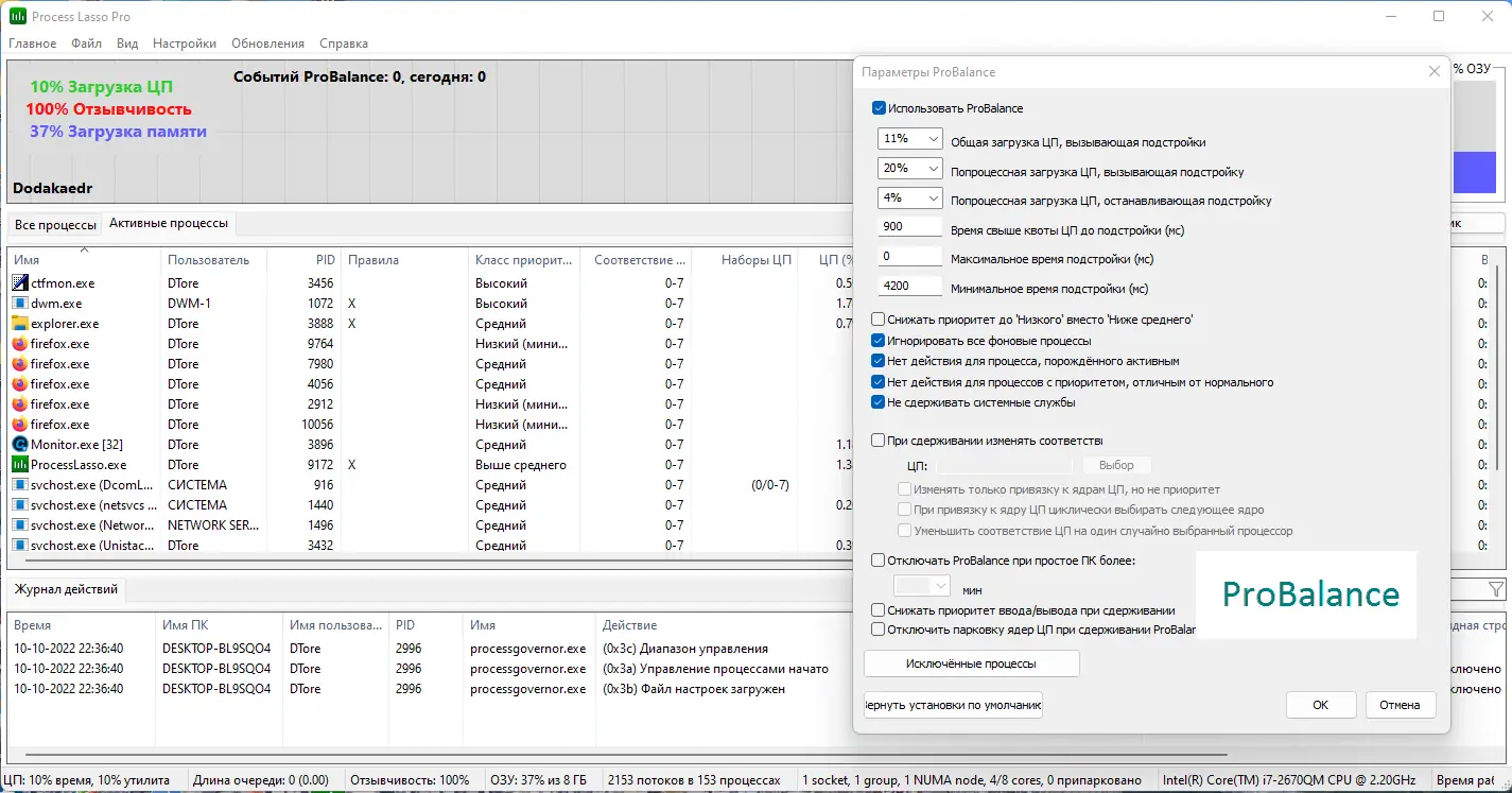 Технология ProBalance обеспечивает незаметное, но эффективное распределение ресурсов, позволяя системе оставаться отзывчивой даже при высокой нагрузке.