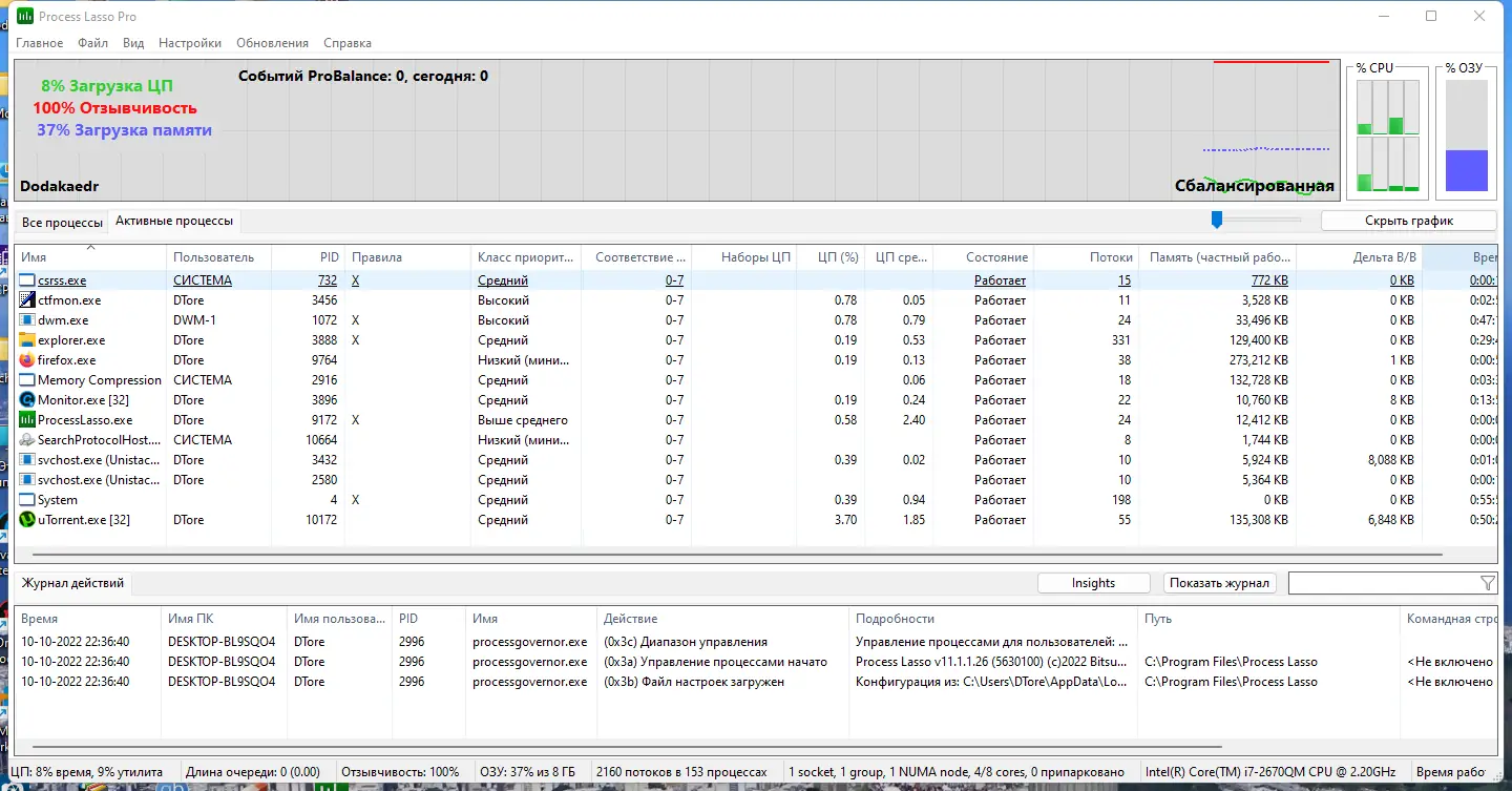 Process Lasso разработан для тонкого контроля над производительностью системы на уровне процессов. В отличие от стандартного диспетчера задач, утилита способна не просто отображать активные задачи, но и управлять их поведением в реальном времени. Это достигается за счёт автоматического анализа нагрузки на ЦП и своевременного вмешательства в работу ресурсоёмких приложений. Особенно полезна программа в условиях ограниченных аппаратных ресурсов, когда даже незначительная перегрузка может привести к тормозам или зависанию.