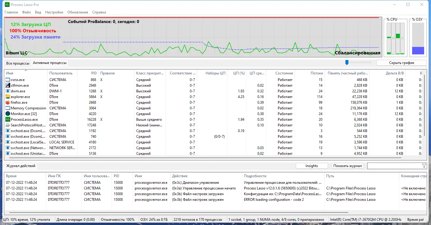 Process Lasso предлагает широкие возможности для оптимизации производительности, особенно на системах со средними или слабыми ресурсами. Программа эффективно справляется с типичными проблемами, связанными с несбалансированной загрузкой процессора, и предотвращает зависания без необходимости перезагрузки. Её можно использовать как новичкам, так и продвинутым пользователям, благодаря гибкости настройки и подробной аналитике.