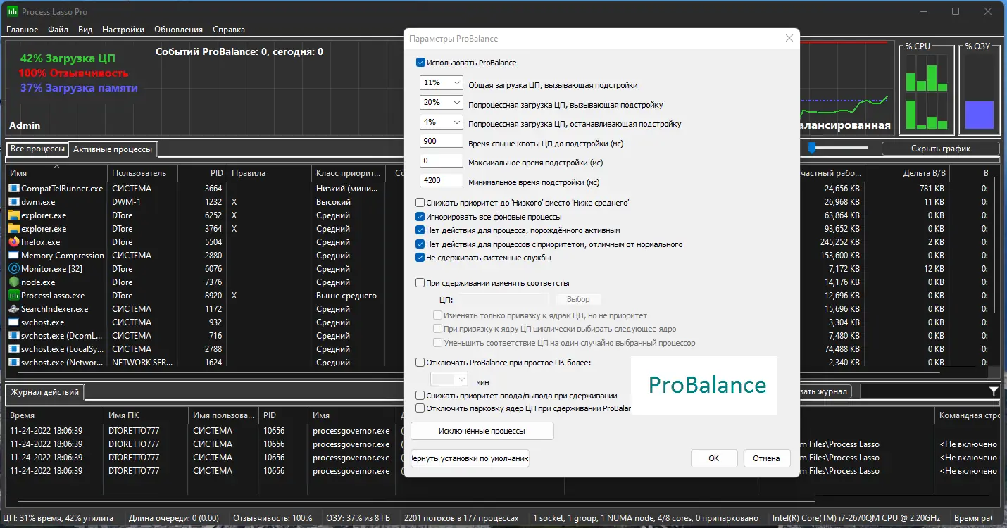 Process Lasso — это мощная системная утилита, предназначенная для управления процессами в операционной системе Windows. Программа автоматически оптимизирует приоритеты запущенных задач, предотвращая перегрузку процессора и обеспечивая высокую отзывчивость системы. Благодаря технологии ProBalance, она эффективно снижает влияние активных процессов на общую производительность, делая работу за компьютером более плавной и стабильной.