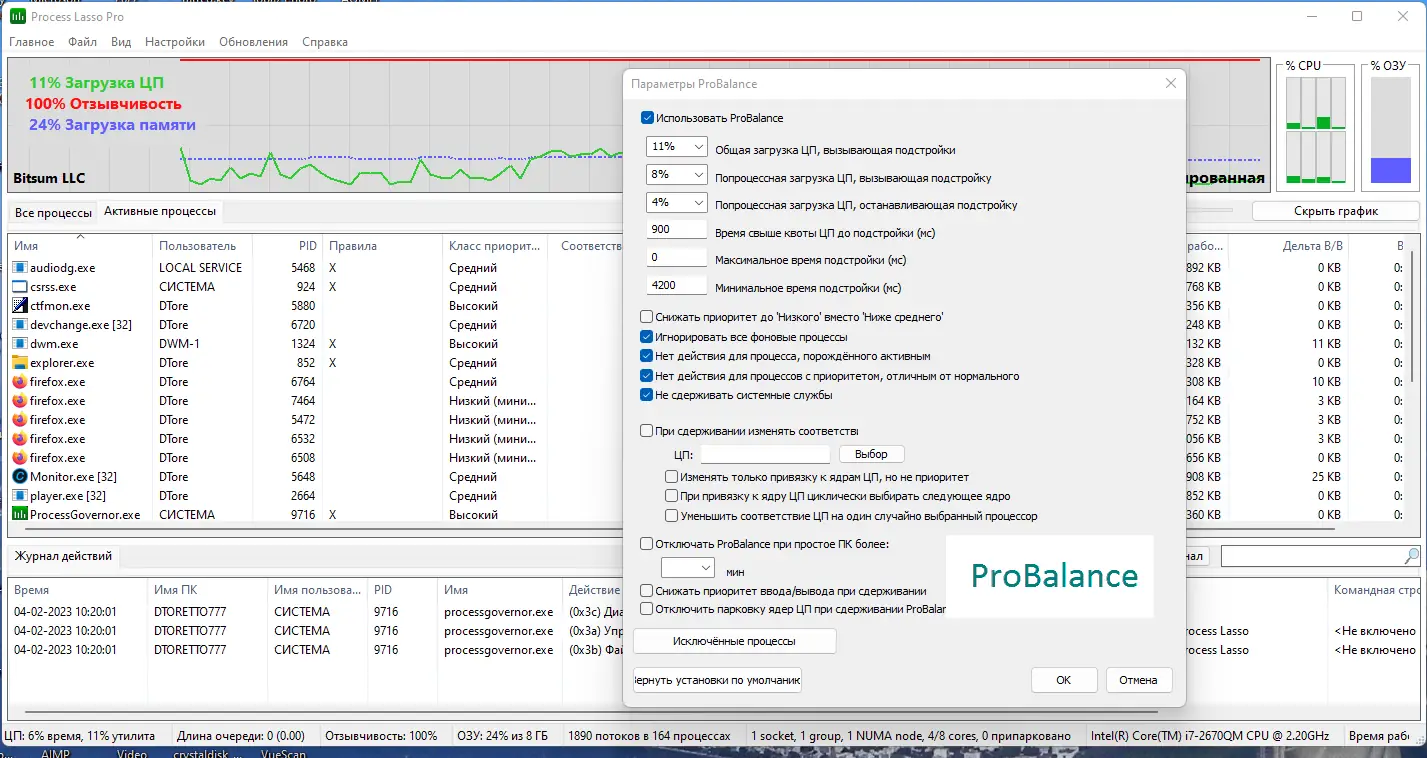 Технология ProBalance обеспечивает плавную работу системы без вмешательства пользователя, даже при высокой нагрузке
