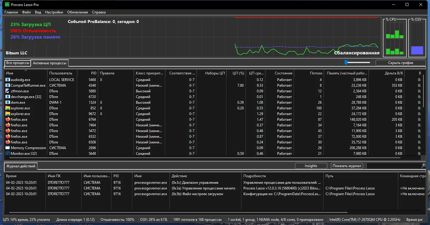 Process Lasso — это мощная системная утилита для управления процессами в операционной системе Windows, способная повысить отзывчивость компьютера за счёт интеллектуального регулирования приоритетов запущенных программ. Программа эффективно предотвращает зависания системы, вызванные чрезмерной нагрузкой на процессор, и автоматически корректирует поведение ресурсоёмких приложений. Благодаря технологии ProBalance, утилита обеспечивает стабильную работу даже при высокой загрузке ЦП.