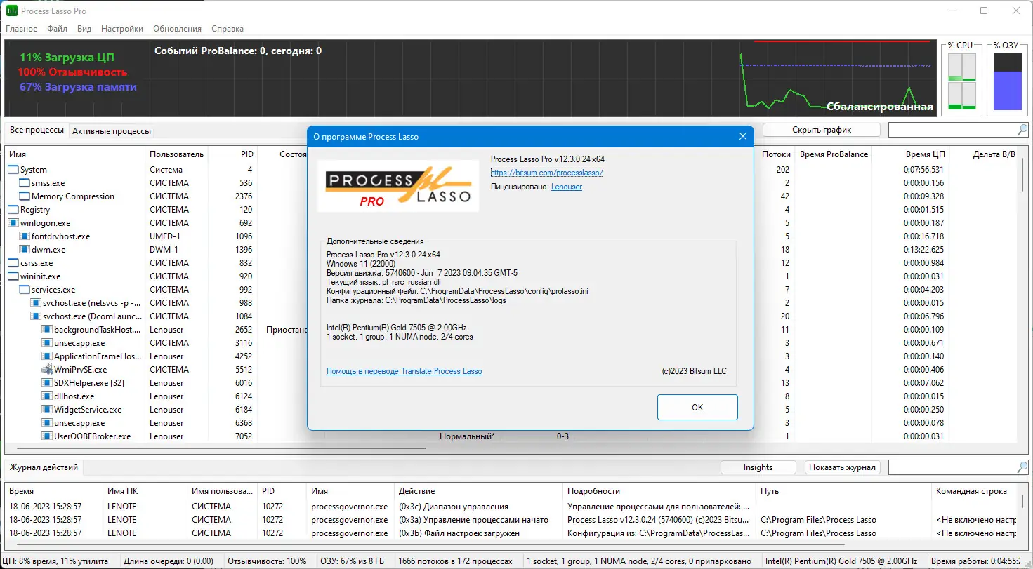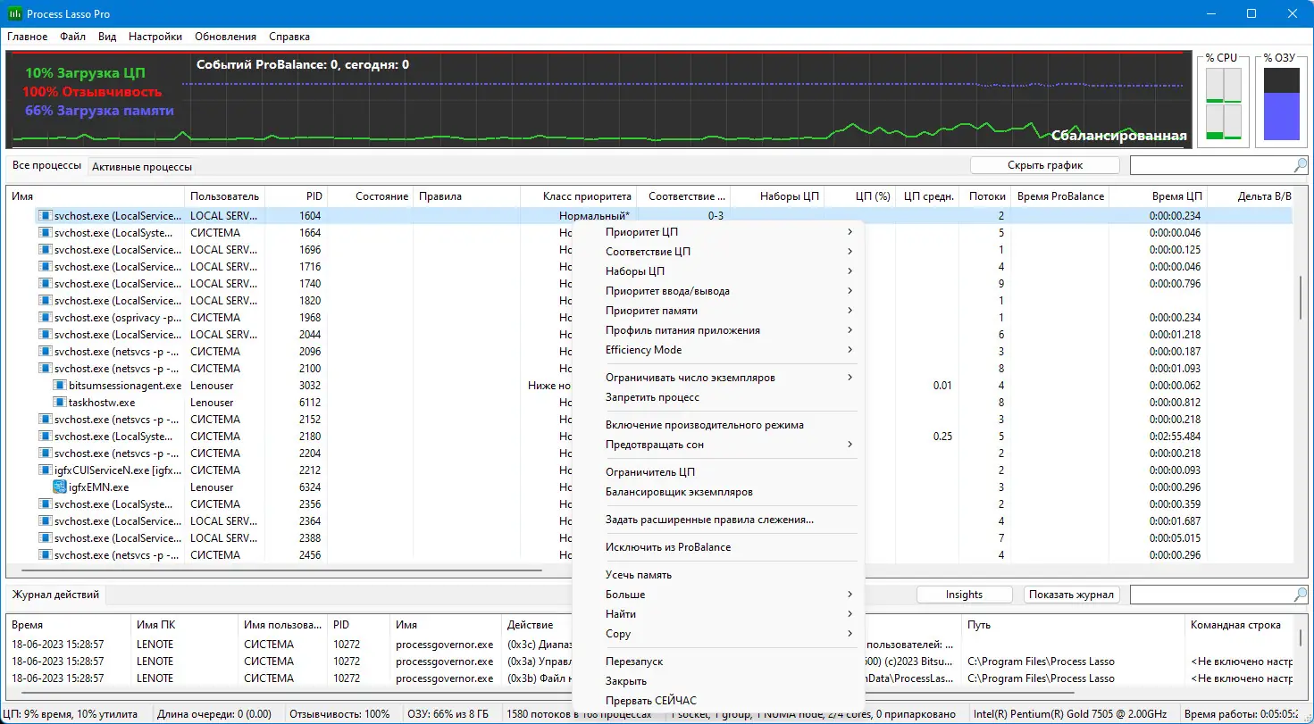 Process Lasso — это системная утилита, предназначенная для управления процессами операционной системы с целью повышения отзывчивости и стабильности работы компьютера. Программа автоматически регулирует приоритеты запущенных приложений, предотвращая перегрузку центрального процессора. Благодаря технологии ProBalance достигается плавная работа системы даже при высокой нагрузке.