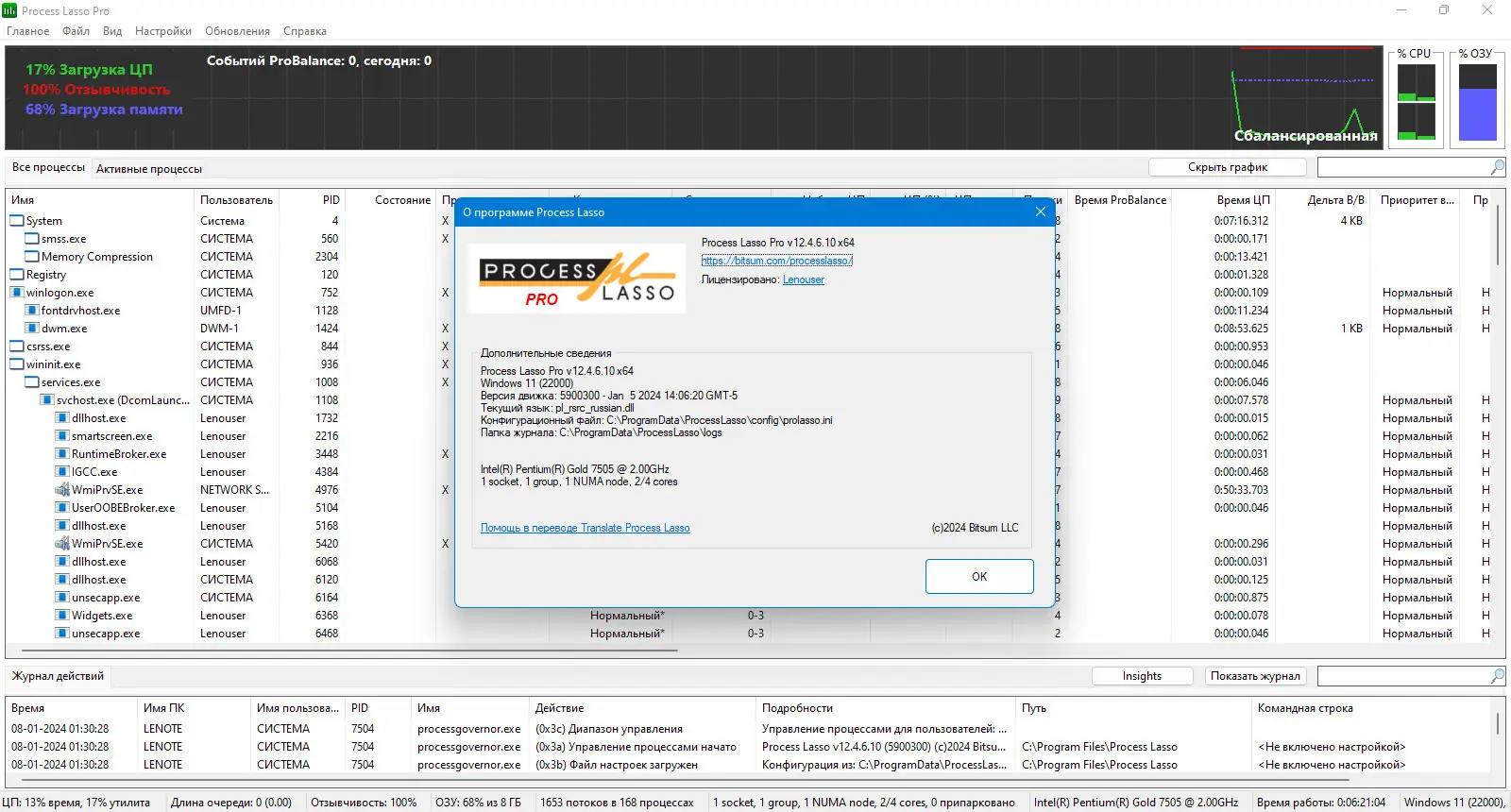 Process Lasso — это интеллектуальная утилита для управления процессами в операционной системе Windows, обеспечивающая стабильность и отзывчивость компьютера за счёт автоматической оптимизации приоритетов запущенных приложений. Программа предотвращает зависания системы при высокой нагрузке на процессор, динамически регулируя поведение фоновых задач. Благодаря технологии ProBalance, система остаётся плавной даже при интенсивной многозадачности.