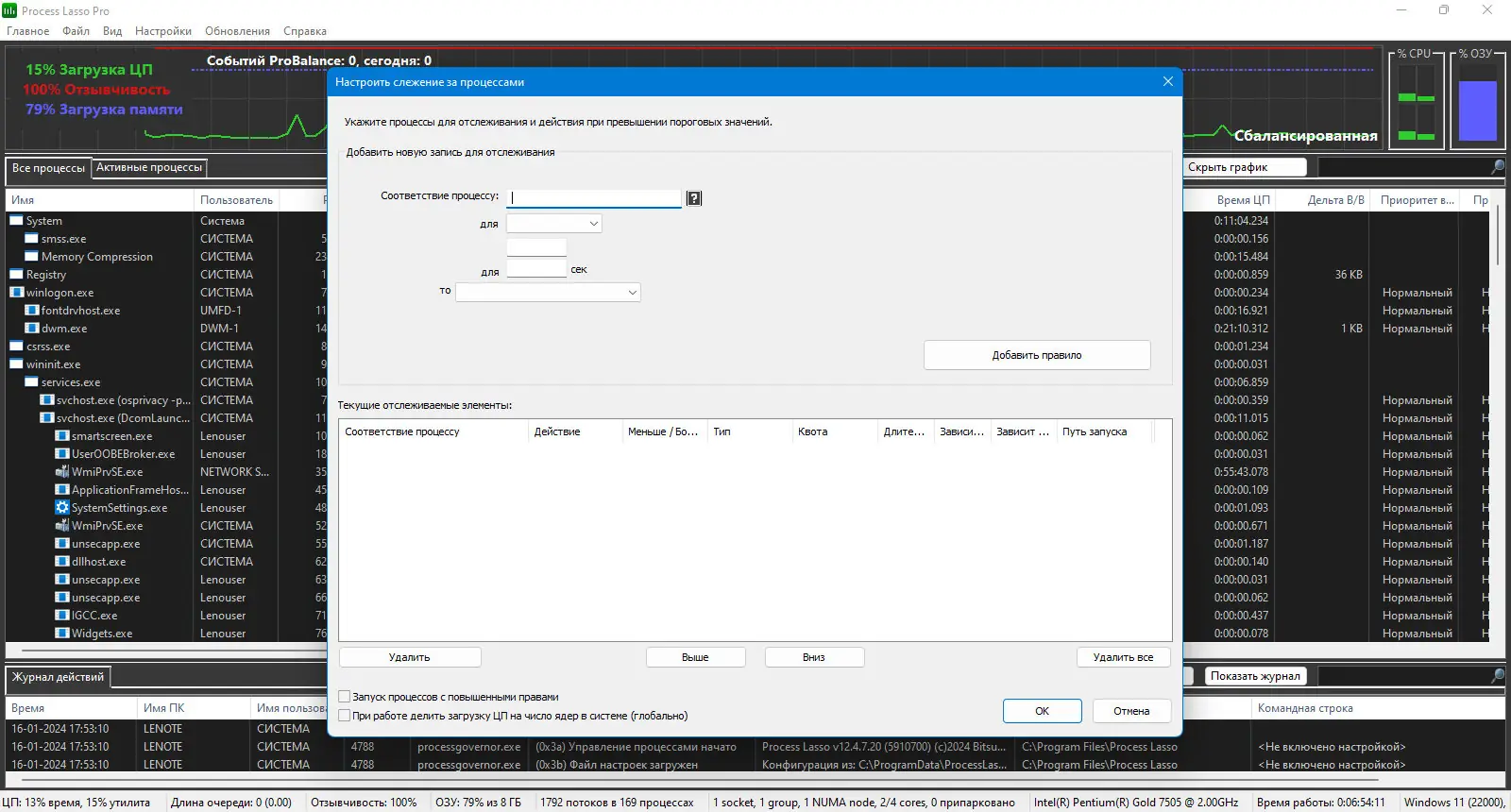 Интерфейс Process Lasso интуитивно понятен и не требует глубоких технических знаний для базового использования. Через контекстное меню, вызываемое правой кнопкой мыши, можно быстро изменить приоритет любого процесса или задать правила его поведения. Программа также позволяет создавать пользовательские профили, устанавливать ограничения на количество копий приложений и настраивать реакцию на появление определённых процессов.