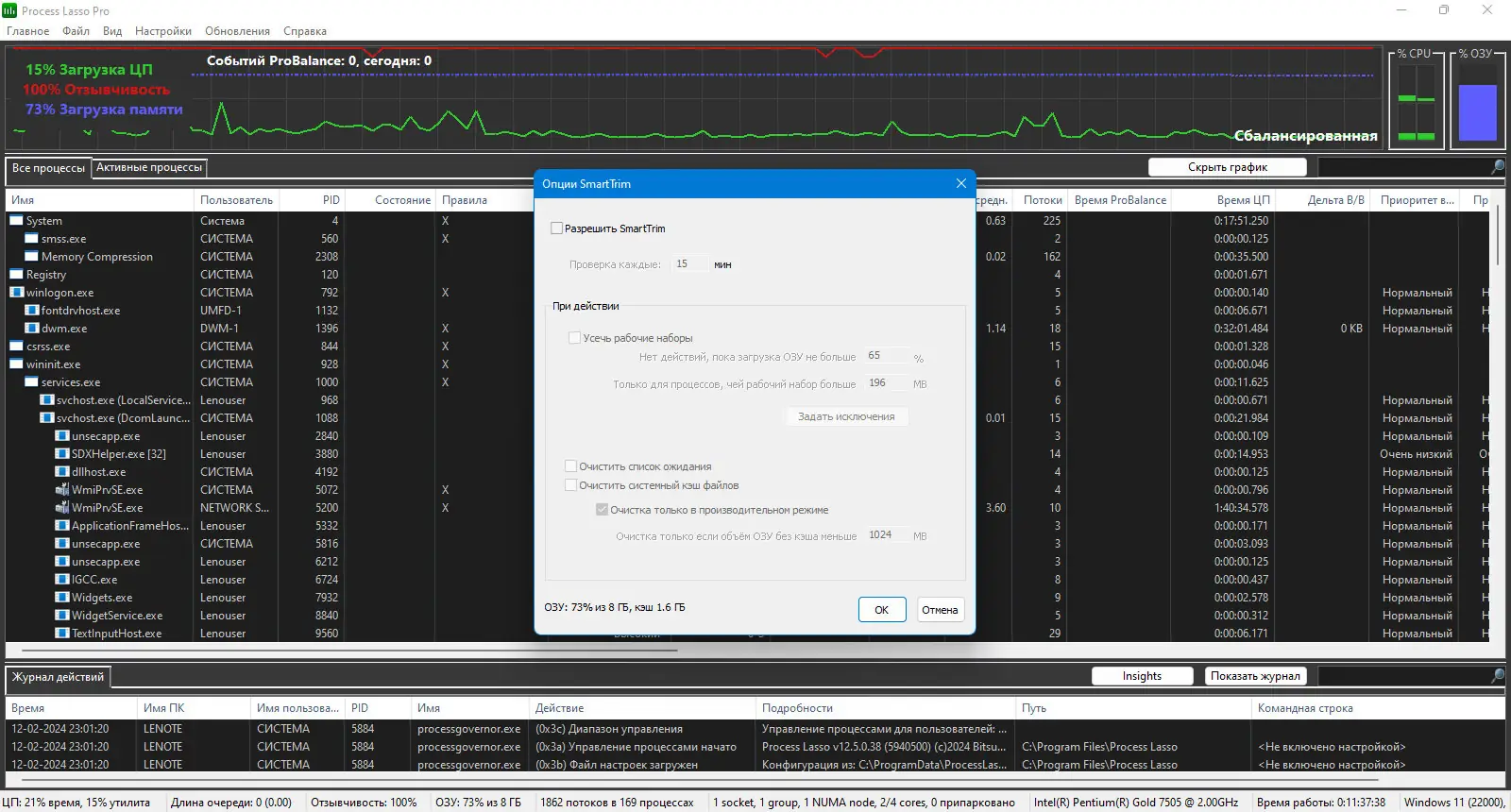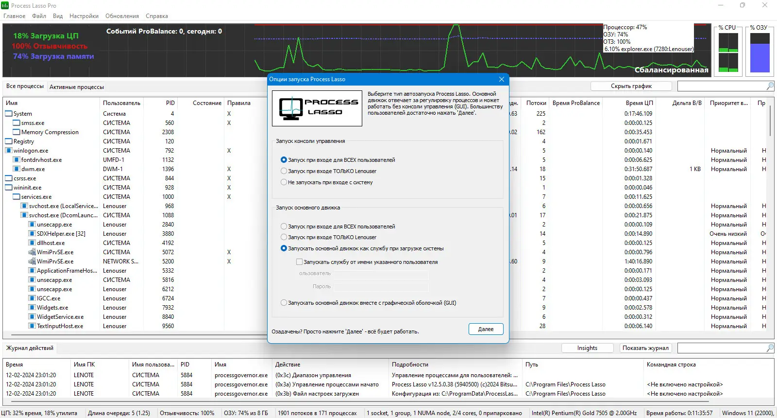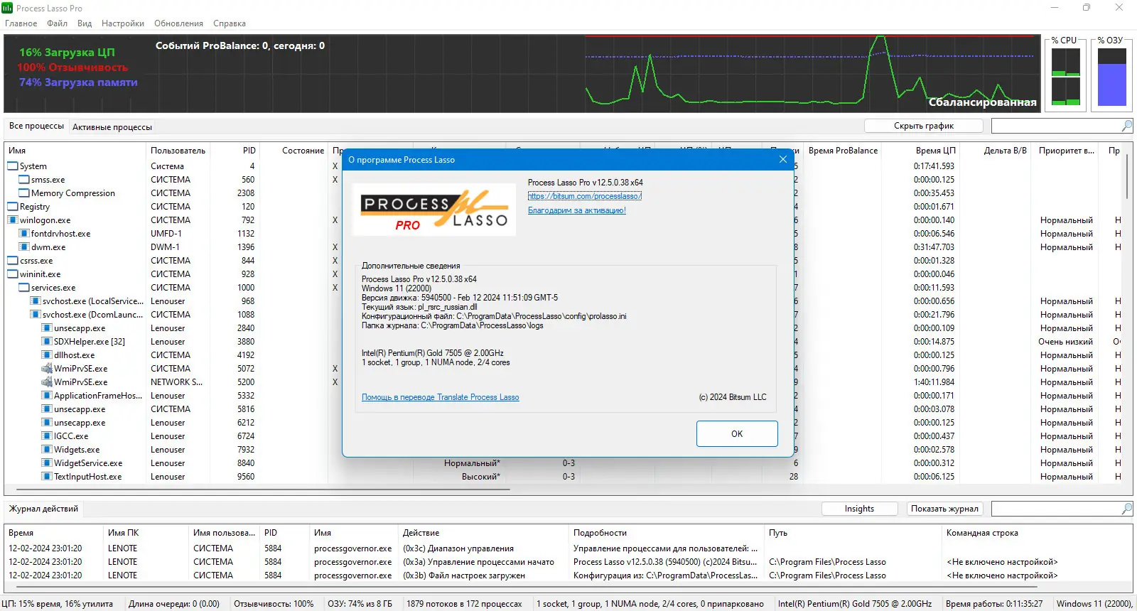 Process Lasso — это интеллектуальная утилита для управления процессами в операционной системе Windows, направленная на повышение отзывчивости и стабильности компьютера. Программа автоматически регулирует приоритеты запущенных приложений, предотвращая перегрузку центрального процессора и замедление системы. Благодаря технологии ProBalance она эффективно снижает влияние ресурсоёмких задач на общую производительность.