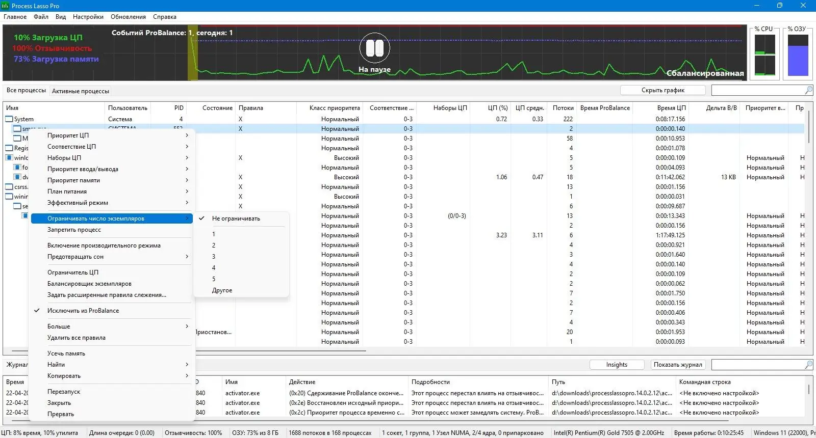 Process Lasso предназначен для тонкого контроля над выполняющимися в системе процессами, позволяя пользователю или автоматически корректировать их приоритеты и распределение ресурсов. Одной из ключевых особенностей является технология ProBalance, которая отслеживает поведение программ, чрезмерно нагружающих процессор, и временно понижает их приоритет, не прерывая их работу. Это позволяет сохранить плавность интерфейса и быструю реакцию на действия пользователя, даже если фоновые задачи потребляют значительные вычислительные мощности.