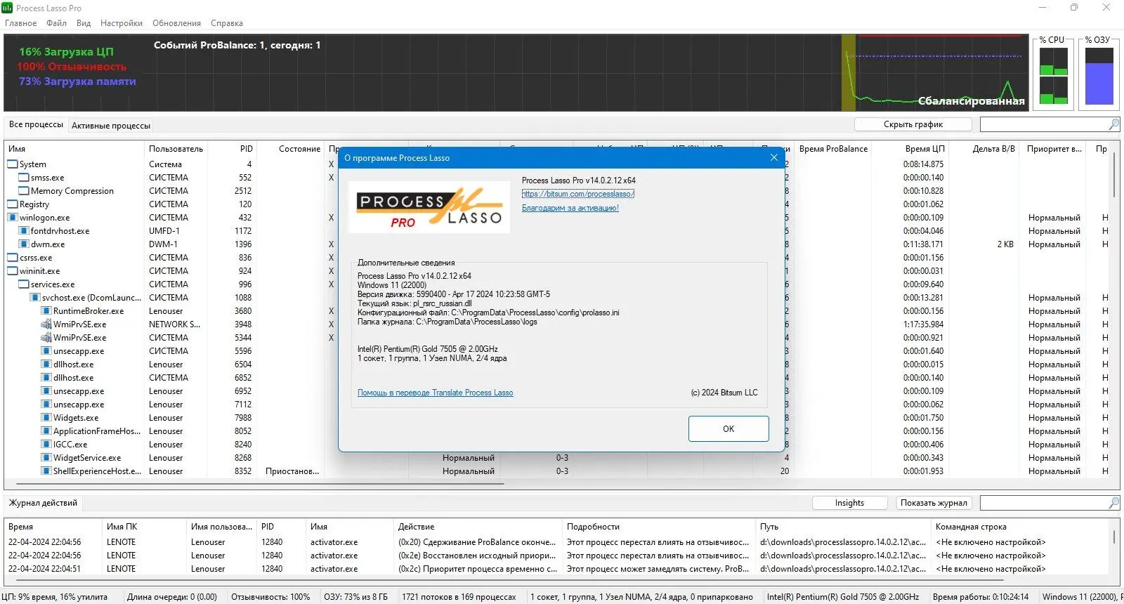 Process Lasso — это мощная системная утилита для управления запущенными процессами, обеспечивающая стабильность и отзывчивость операционной системы за счёт автоматической оптимизации приоритетов задач. Программа эффективно предотвращает перегрузку центрального процессора, динамически регулируя поведение активных приложений. Благодаря технологии ProBalance, система остаётся отзывчивой даже при высокой нагрузке.