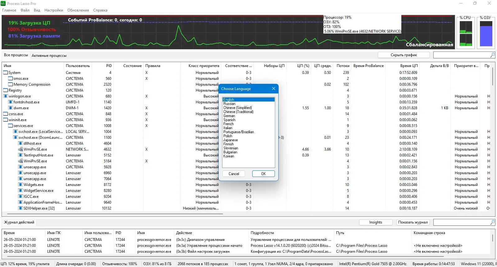 Process Lasso — это инструмент для управления процессами в операционной системе Windows, направленный на повышение отзывчивости и стабильности работы компьютера. Программа автоматически регулирует приоритеты запущенных приложений, предотвращая чрезмерную нагрузку на центральный процессор. Благодаря технологии ProBalance система остаётся отзывчивой даже при высокой загрузке CPU.