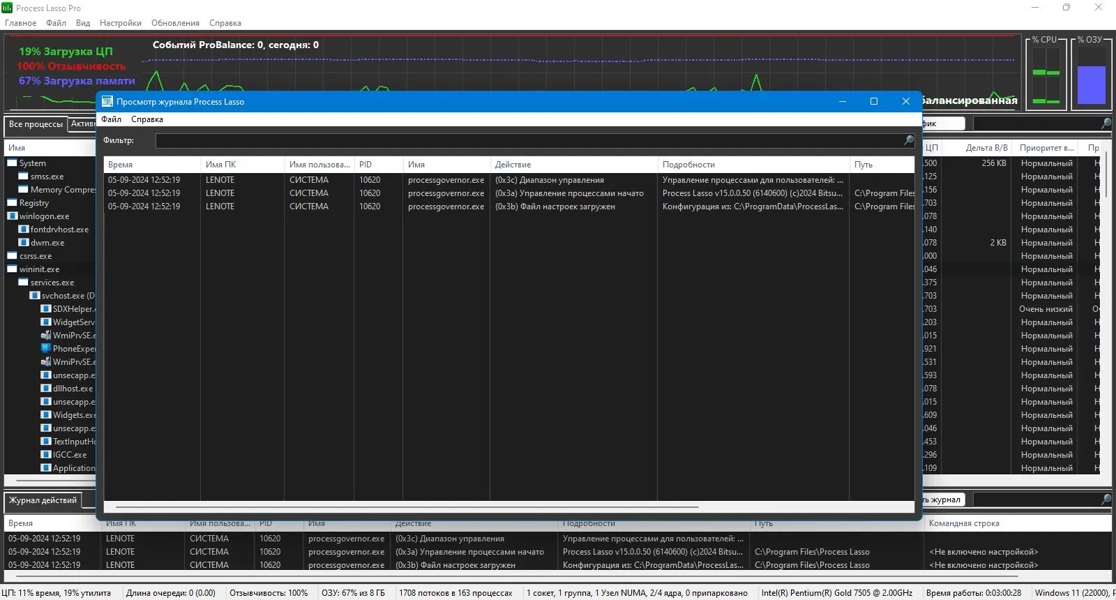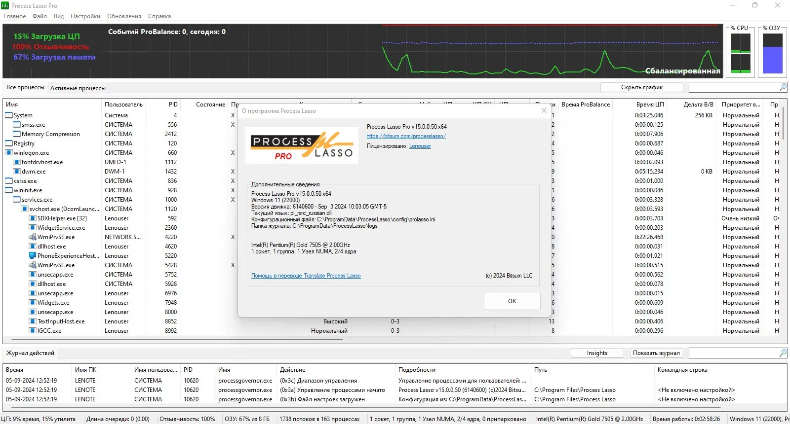 Process Lasso предназначена для управления фоновыми и активными процессами, что особенно актуально при одновременном запуске нескольких ресурсоёмких приложений. Программа не убивает процессы, а корректирует их поведение в системе, что позволяет избежать сбоев и зависаний. В основе её работы лежит технология ProBalance, которая анализирует поведение процессов в реальном времени и при необходимости снижает их приоритет, не прерывая выполнение задач.