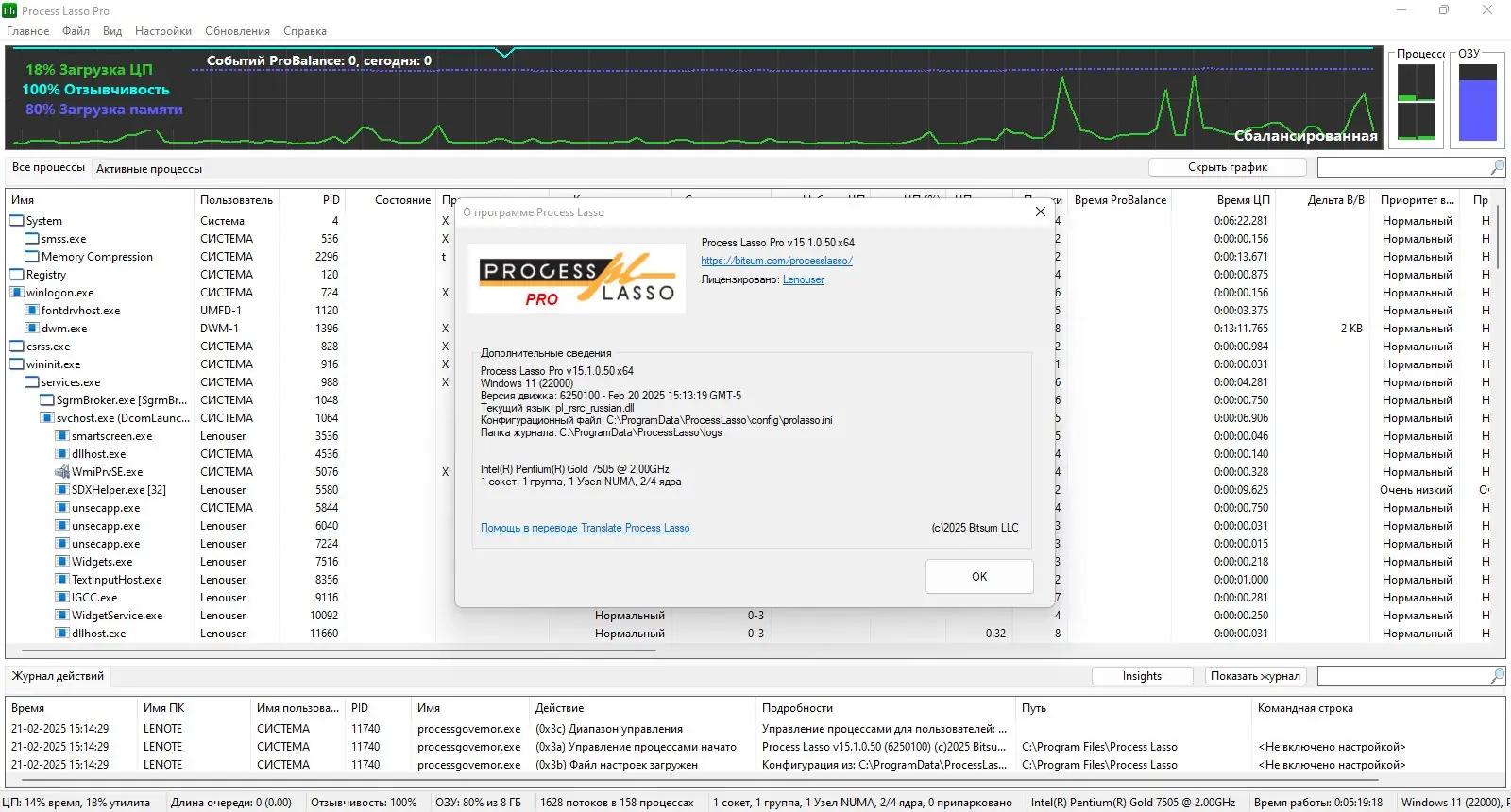 Программа Process Lasso предназначена для управления активными процессами в реальном времени, предотвращая перегрузку центрального процессора и повышая общую производительность системы. В отличие от стандартного диспетчера задач Windows, она не просто отображает информацию, а активно вмешивается в распределение ресурсов. Благодаря технологии ProBalance, утилита динамически корректирует приоритеты фоновых приложений, освобождая ресурсы для активных задач. Это позволяет избежать лагов и зависаний, особенно при одновременной работе с несколькими ресурсоёмкими программами. Такой подход особенно полезен на системах со слабым или устаревшим «железом», где каждый процент производительности на счету.