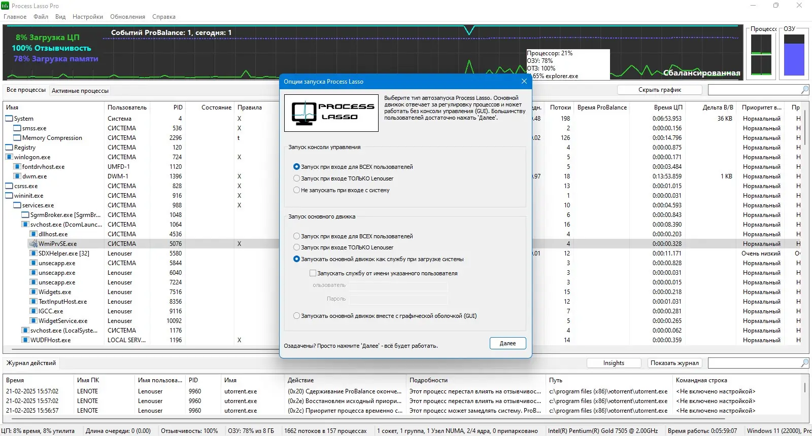 Process Lasso — утилита для тонкой настройки приоритетов запущенных процессов, обеспечивающая стабильную работу системы и улучшение отзывчивости операционной среды даже при высокой нагрузке на процессор.