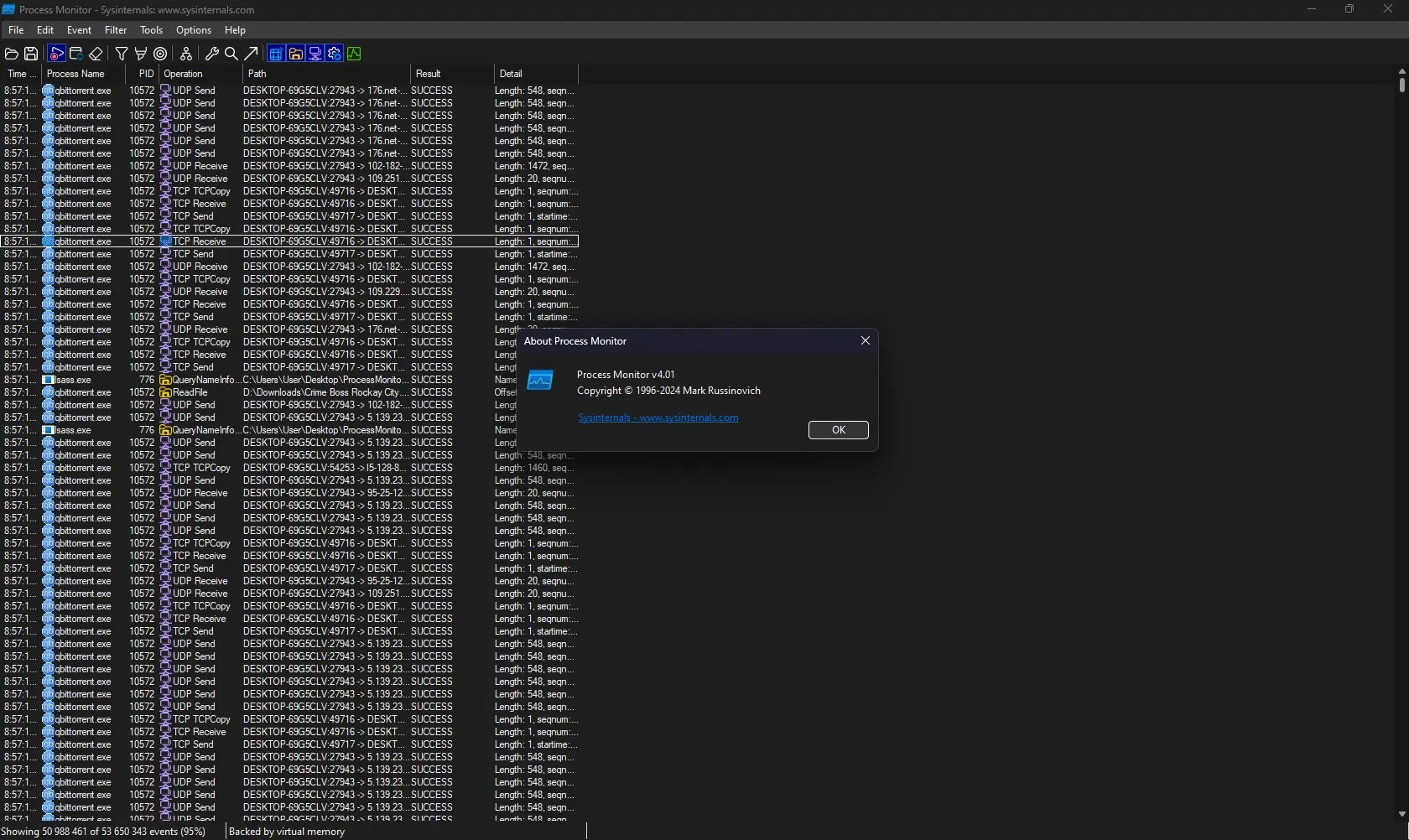 Запуск Process Monitor не требует установки — программа работает в портативном режиме. После запуска начинается автоматический захват событий, который можно приостановить кнопкой «Capture». Для фокусировки на нужных процессах используются фильтры: например, можно отфильтровать события по имени процесса, типу операции или пути к файлу. Каждое событие отображается в виде строки с подробными атрибутами, а двойной щелчок открывает окно с детализацией, включая стек вызовов и параметры операции. Результаты можно экспортировать в файлы различных форматов для последующего анализа. Поддержка поиска и закладок упрощает навигацию по большим объёмам данных.