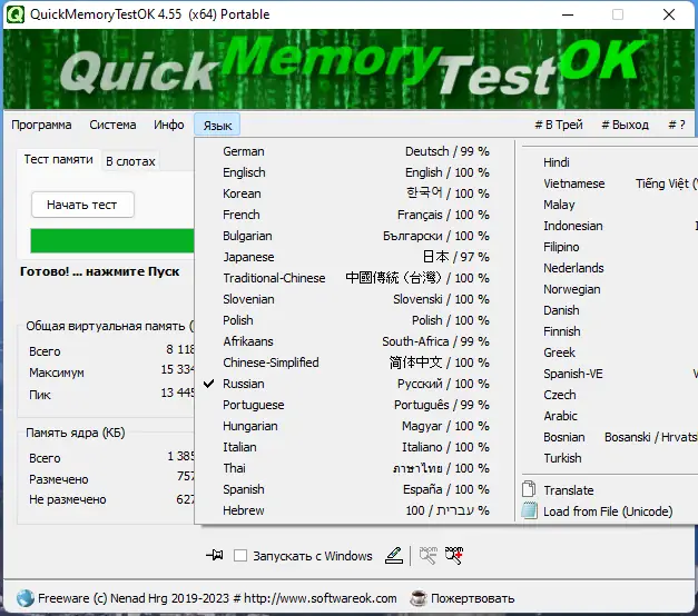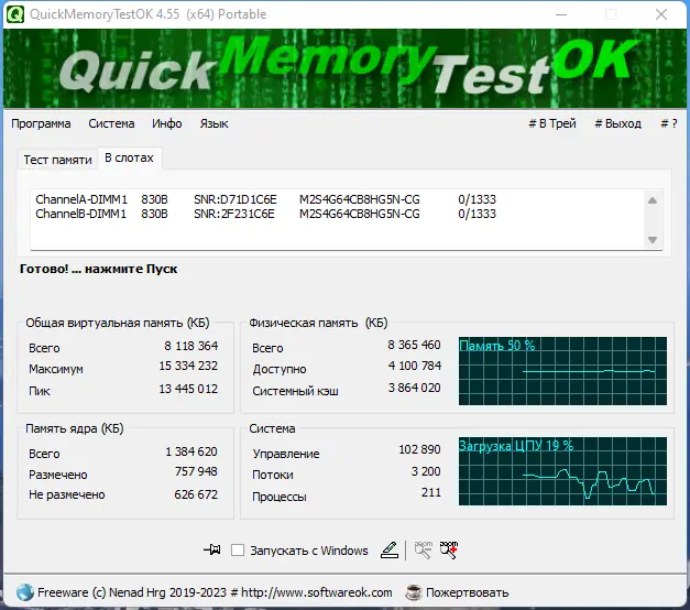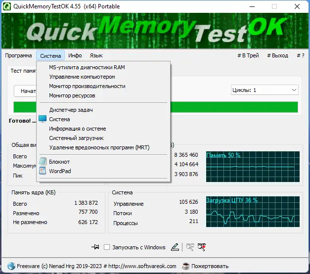 QuickMemoryTestOK — это компактная и эффективная утилита для диагностики оперативной памяти, позволяющая выявить неисправные участки ОЗУ на ранних этапах эксплуатации компьютера. Программа помогает протестировать полный объем установленной памяти, включая резервные и редко используемые области. Благодаря минимальным требованиям и отсутствию необходимости в установке, она подходит для регулярного использования при настройке систем.
