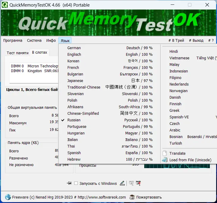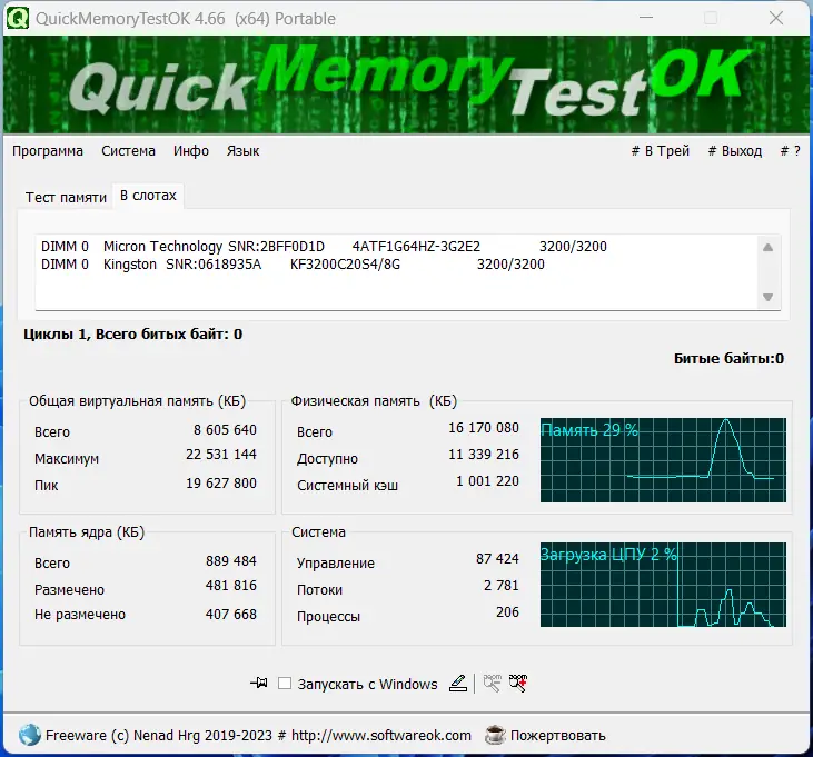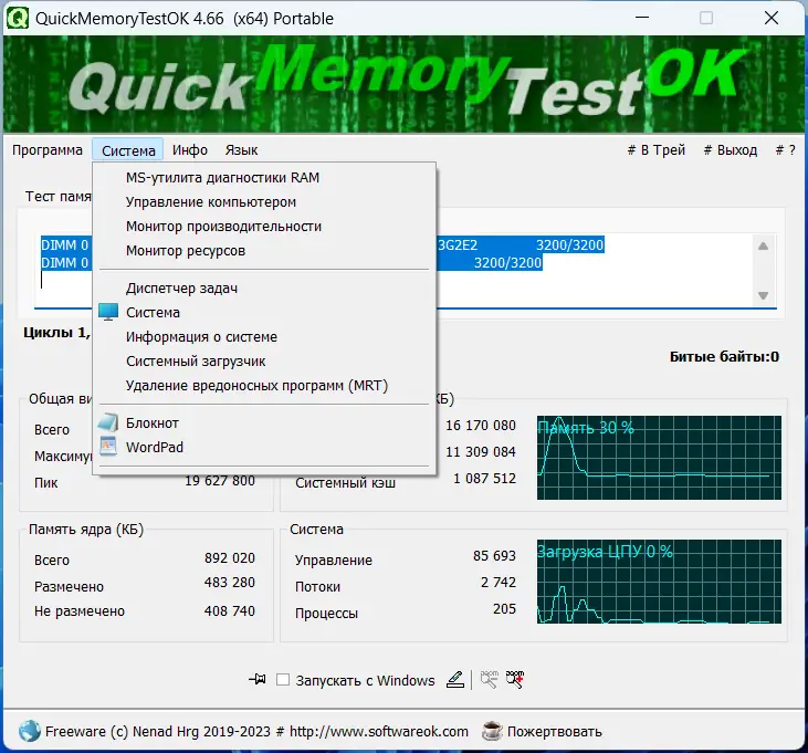QuickMemoryTestOK — компактная утилита для диагностики оперативной памяти, позволяющая быстро выявить ошибки и проанализировать поведение системы под высокой нагрузкой. Программа не требует установки, работает с минимальным потреблением ресурсов и подходит как для обычных пользователей, так и для специалистов по тестированию оборудования. С её помощью можно оперативно определить, связана ли нестабильность системы с проблемами в работе RAM.