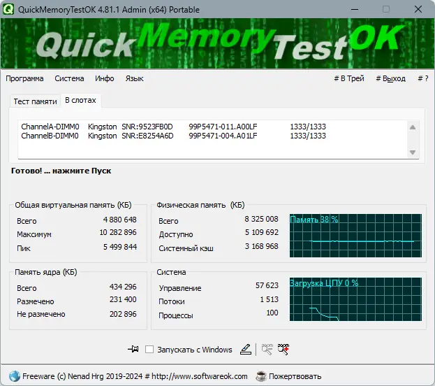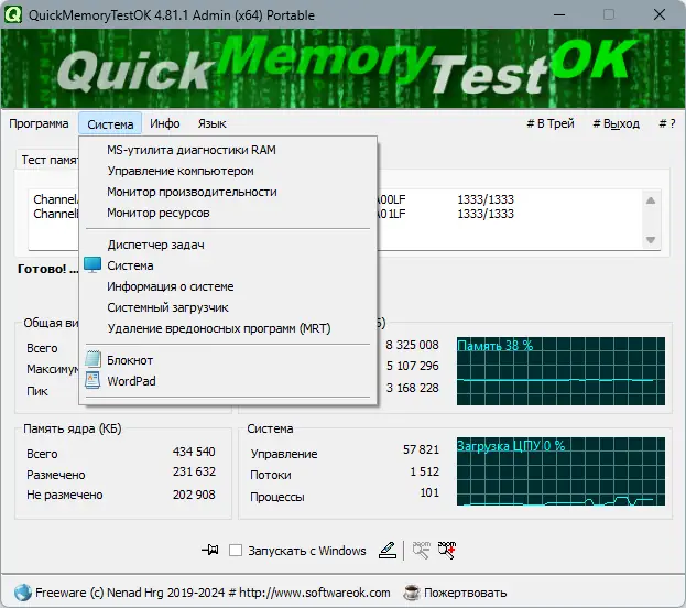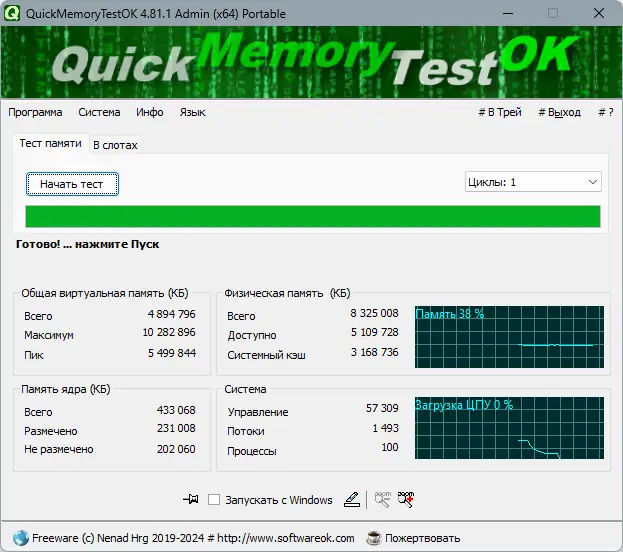 QuickMemoryTestOK — компактная утилита для диагностики оперативной памяти, позволяющая быстро выявить сбои в работе RAM и оценить стабильность системы под нагрузкой. Программа не требует установки, потребляет минимум ресурсов и предоставляет детальную информацию о состоянии памяти и загрузке процессора. Подходит как для диагностики нестабильной работы ПК, так и для тестирования производительности в условиях высокой нагрузки.