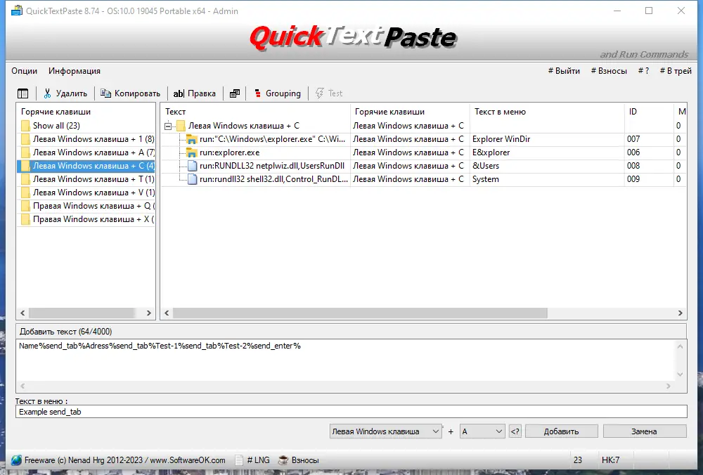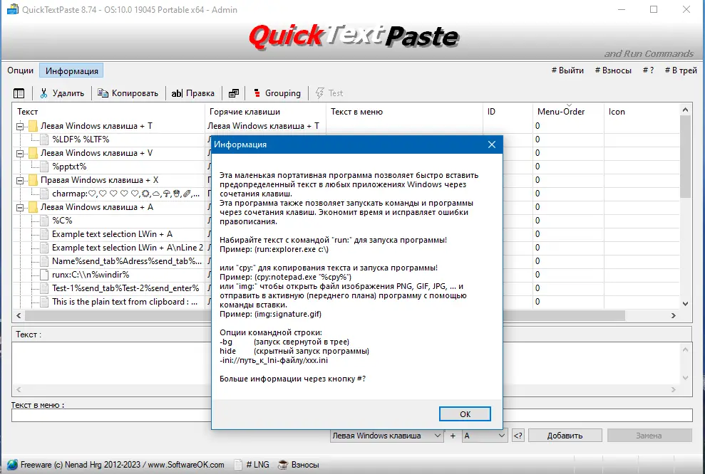 QuickTextPaste — это компактная и эффективная утилита для быстрой вставки часто используемых текстовых фрагментов с помощью горячих клавиш. Программа идеально подходит для пользователей, которым приходится регулярно вводить однотипные сообщения, электронные адреса, шаблоны ответов или команды. Она работает в фоновом режиме и позволяет значительно ускорить рутинные операции ввода.