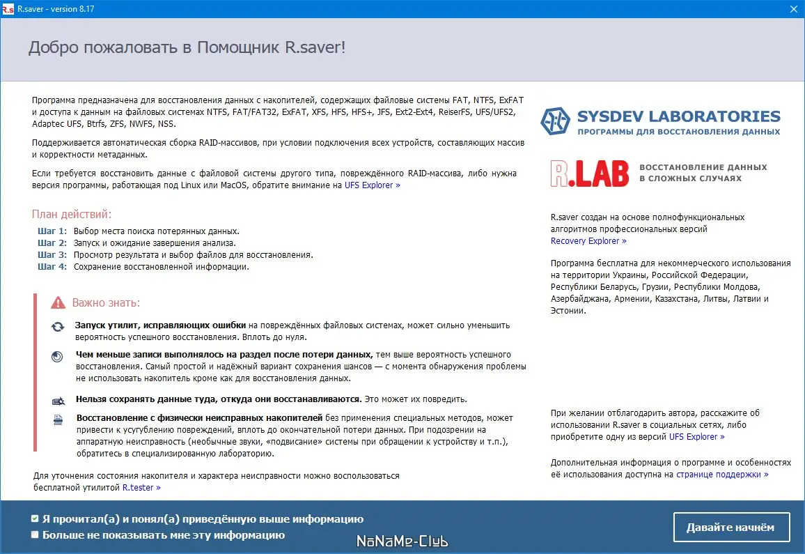 Для корректной работы R.saver необходимо запускать её с носителя, не содержащего восстанавливаемые данные, чтобы избежать перезаписи.