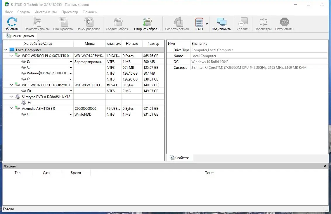 Интерфейс R-Studio построен по принципу стандартного проводника Windows, что упрощает навигацию и работу с дисками. После запуска приложение автоматически определяет все подключённые устройства и отображает их в древовидной структуре. Пользователь может инициировать быстрое или глубокое сканирование, выбрать конкретный раздел или весь физический диск, а также подключиться к удалённому компьютеру по сети для восстановления данных на нём.