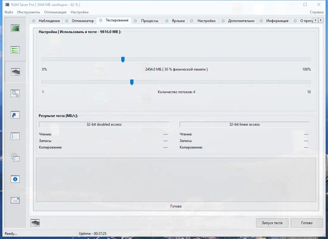 Использование RAM Saver не требует глубоких технических знаний. После запуска программа автоматически начинает отслеживать состояние оперативной памяти и при необходимости запускает процедуру очистки. Пользователь может настроить уровень срабатывания оптимизации, указав порог загрузки RAM, при котором будет запускаться очистка. Дополнительно доступен ручной режим, позволяющий немедленно освободить память по требованию, а также закрыть все приложения одним кликом.