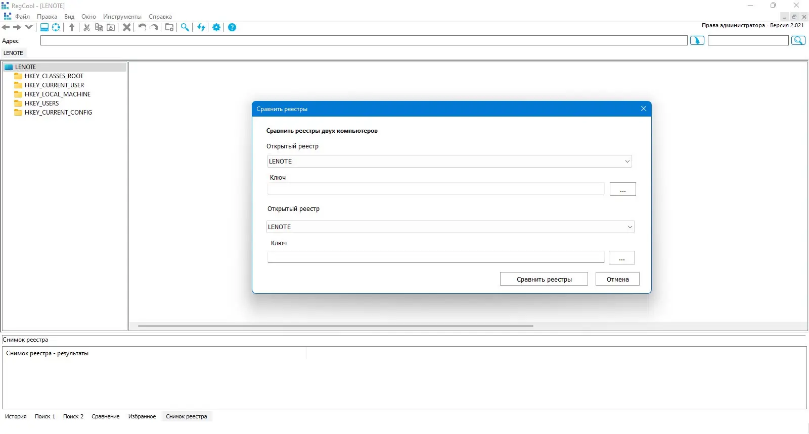 - Поддержка сравнения двух снимков реестра для выявления изменений