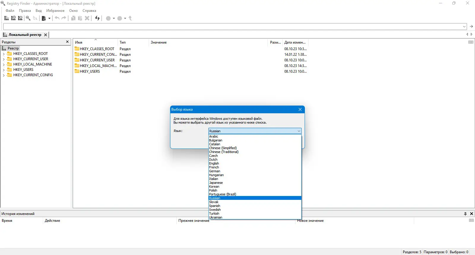 Registry Finder предоставляет удобный доступ к реестру операционной системы без необходимости использовать стандартный редактор реестра. Интерфейс приложения интуитивно понятен, поддерживает вкладки и позволяет одновременно работать с несколькими разделами. Все изменения фиксируются в истории, что даёт возможность отменить или повторить операции, включая удаление и замену элементов. Благодаря поддержке тёмной темы и гибкой настройке внешнего вида, программа комфортна в длительной работе.