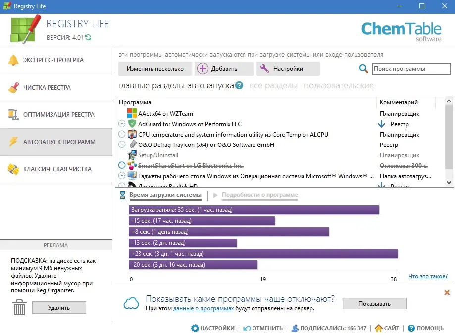 - Выполняет дефрагментацию и сжатие файлов реестра, что снижает нагрузку на диск и ускоряет чтение системной информации.