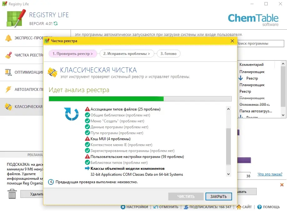 - Проводит проверку реестра на наличие более чем 10 типов ошибок, включая битые ссылки, неверные ассоциации файлов и невалидные пути в автозагрузке.