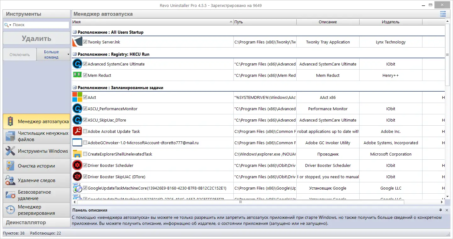 - Эффективное удаление следов программ, включая ключи реестра и временные файлы.