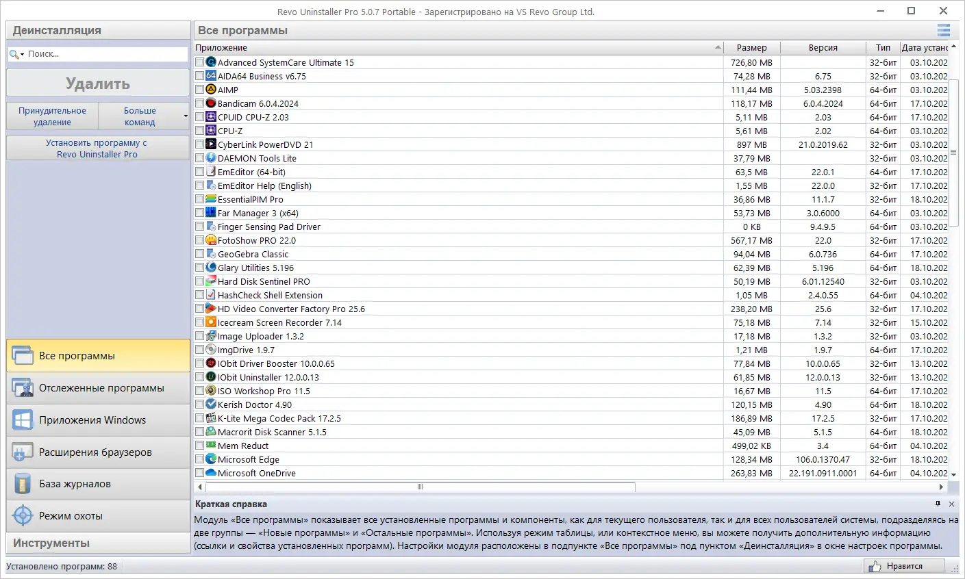 Revo Uninstaller — это мощная утилита для точного и полного удаления программ с компьютера. Программа сканирует систему до и после деинсталляции, удаляя не только приложение, но и все оставшиеся файлы, папки и записи в реестре. Благодаря расширенным функциям, таким как режим «Охотник» и принудительная деинсталляция, она подходит как для новичков, так и для опытных пользователей, стремящихся поддерживать систему в чистоте.