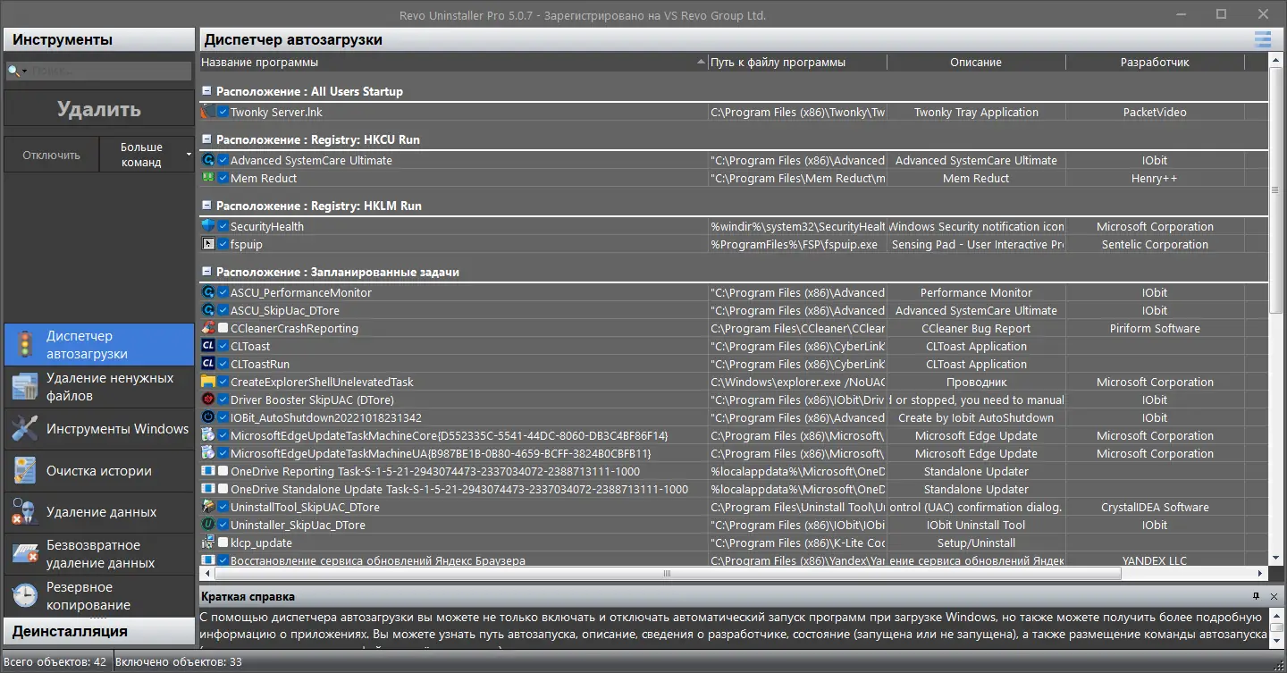 Revo Uninstaller зарекомендовал себя как надёжное и функциональное решение для системной оптимизации. Его основное преимущество — способность удалять программы полностью, включая их «цифровой след». Программа поддерживает множество встроенных инструментов, таких как чистильщик браузеров, менеджер автозапуска и средство безопасного удаления файлов. Интерфейс интуитивно понятен, а многоуровневая система резервного копирования минимизирует риски при внесении изменений в реестр. Тем не менее, некоторые расширенные функции доступны только в версии pro, что может быть ограничением для пользователей, ищущих бесплатные решения.
