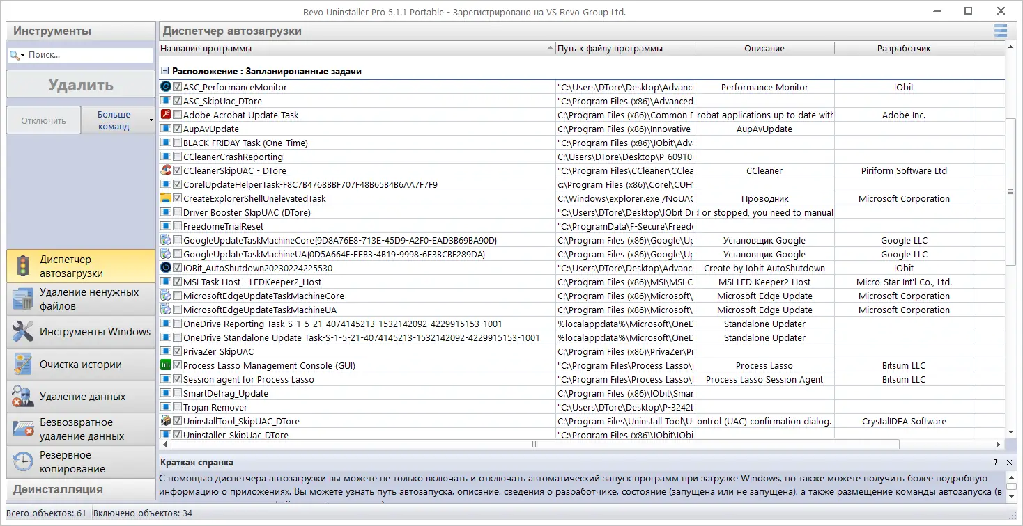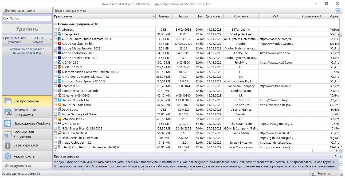 Revo Uninstaller — это мощная системная утилита для полного и безопасного удаления программ, остатков реестра и временных файлов. Программа сочетает в себе продвинутые алгоритмы сканирования, интуитивный интерфейс и дополнительные инструменты для очистки и оптимизации системы. Благодаря режиму охотника и расширенному анализу изменений, Revo Uninstaller обеспечивает высокую точность деинсталляции.