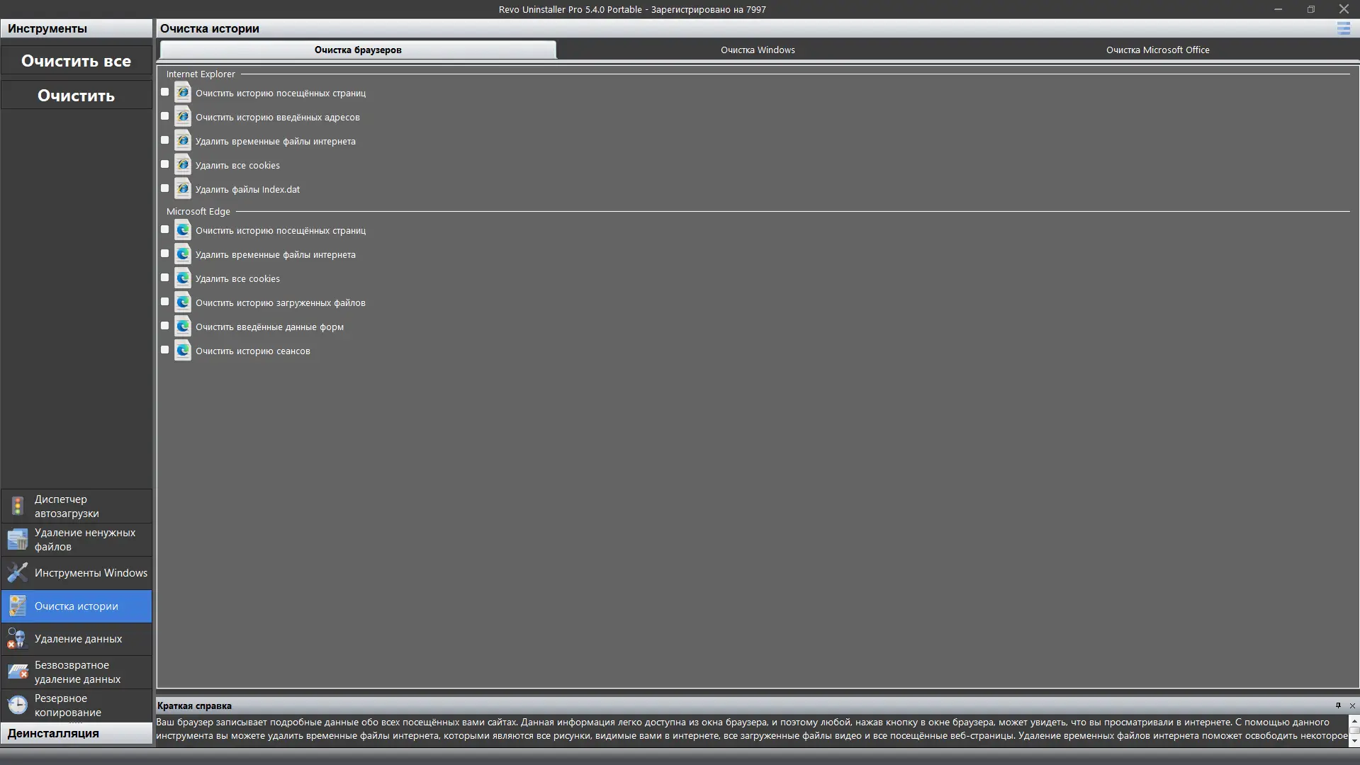 - Поддерживает очистку истории браузеров, временных файлов и данных MS Office