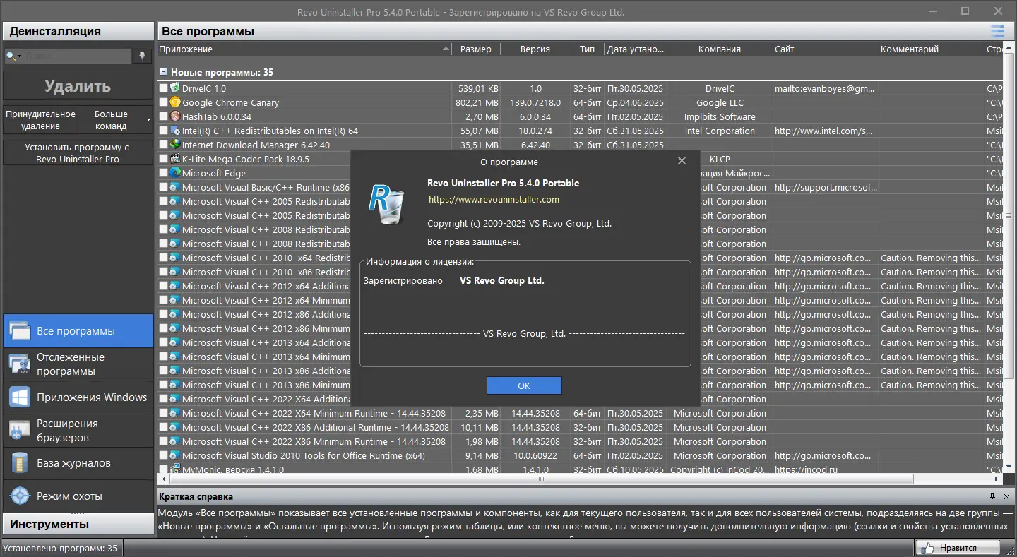 Revo Uninstaller — это мощная система для полного и безопасного удаления программ с компьютера. Программа эффективно удаляет не только приложения, но и все следы, оставшиеся после их деинсталляции: файлы, папки, записи в реестре и данные автозагрузки. Благодаря инновационным режимам и встроенным инструментам оптимизации, Revo Uninstaller помогает поддерживать систему в чистоте и улучшать её производительность. С её помощью можно легко управлять установленным ПО, очищать временные файлы и защищённо удалять конфиденциальные данные.