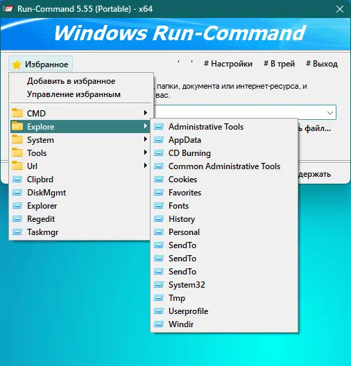 Работа с утилитой интуитивно понятна и не требует специальных знаний. После запуска открывается окно с полем ввода, куда можно ввести любую команду, поддерживаемую системой. Для быстрого запуска администраторских утилит используется кнопка «Запустить от имени администратора», активируемая как через интерфейс, так и с помощью горячих клавиш. Пользователь может добавлять собственные команды в избранное, назначать им имена и иконки, а также распределять по папкам для лучшей структуризации. Поддерживаются пользовательские комбинации клавиш, что позволяет вызывать программу в одно касание. Все настройки сохраняются автоматически, а работа с переменными среды позволяет использовать динамические пути, такие как %TEMP% или %APPDATA%.