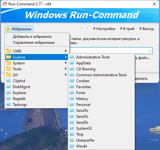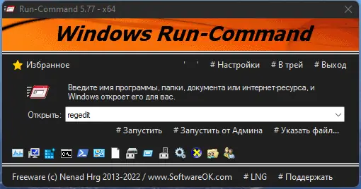 Run-Command — это компактная системная утилита, заменяющая стандартное окно «Выполнить» в Windows, расширяя его функционал за счёт дополнительных инструментов и настроек. Программа позволяет быстро запускать команды, работать с реестром, управлять избранными действиями и выполнять процессы от имени администратора. Её минималистичный интерфейс скрывает мощные возможности, полезные как обычным пользователям, так и системным администраторам.