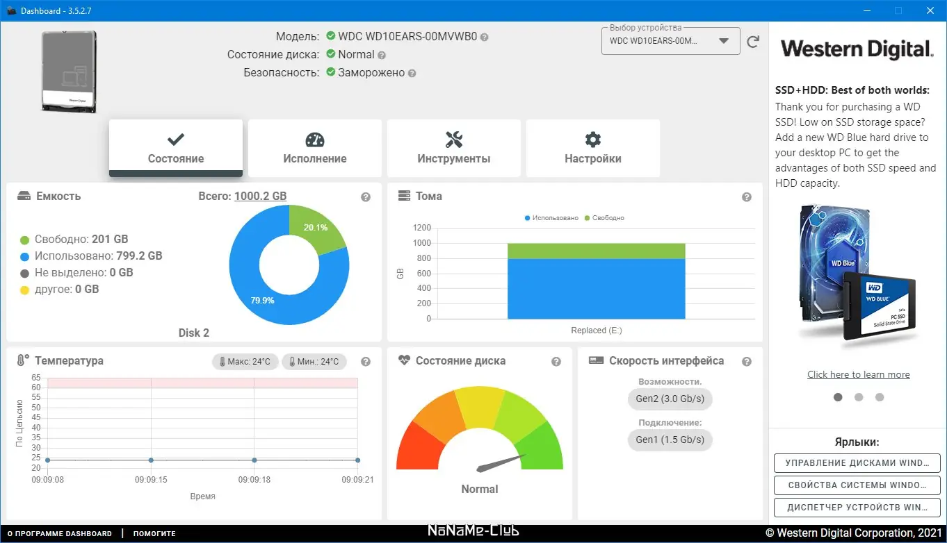 SanDisk SSD Dashboard — официальное приложение от Western Digital для мониторинга, диагностики и обслуживания твердотельных накопителей SanDisk и WD. Программа предоставляет детальную информацию о состоянии диска, включая температуру, износ, скорость чтения и записи, а также поддерживает обновление прошивки и безопасное удаление данных. Инструмент подходит как для обычных пользователей, так и для специалистов, работающих с SSD-накопителями.