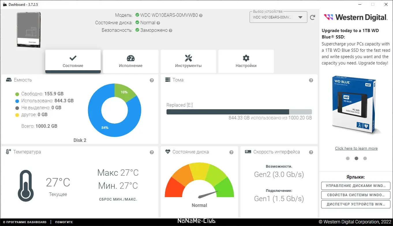 - Проведение тестов производительности и диагностики S.M.A.R.T.