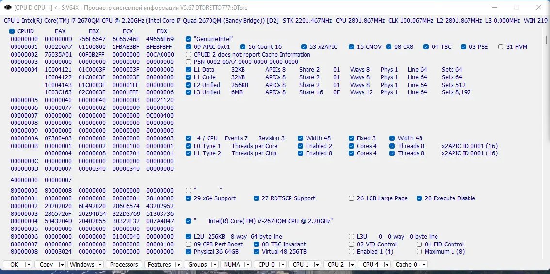 Интерфейс утилиты организован в виде вкладок, каждая из которых отвечает за определённый аспект системы. Для просмотра данных о процессоре достаточно перейти в соответствующий раздел, где отображаются модель, тактовая частота, количество ядер и потоков. Вкладка с памятью показывает объём ОЗУ, тип, частоту и текущее использование, включая кэши и буферы. В разделе видеокарты доступны сведения о драйверах, версии DirectX и текущей температуре GPU.