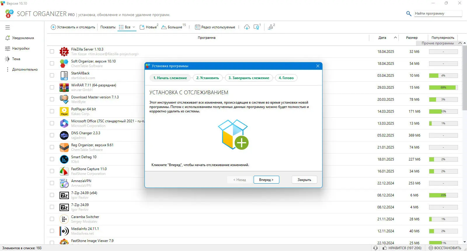 Использование Soft Organizer начинается с отслеживания установки нового приложения. При первом запуске программа предлагает начать мониторинг, после чего все действия установщика фиксируются: создаются файлы, изменяются настройки, добавляются записи в реестр. После завершения установки эти данные сохраняются. В дальнейшем при удалении приложения Soft Organizer использует собранную информацию, чтобы убрать все связанные компоненты. Процедура проста — достаточно выбрать программу из списка и подтвердить удаление, после чего утилита автоматически выполнит очистку.