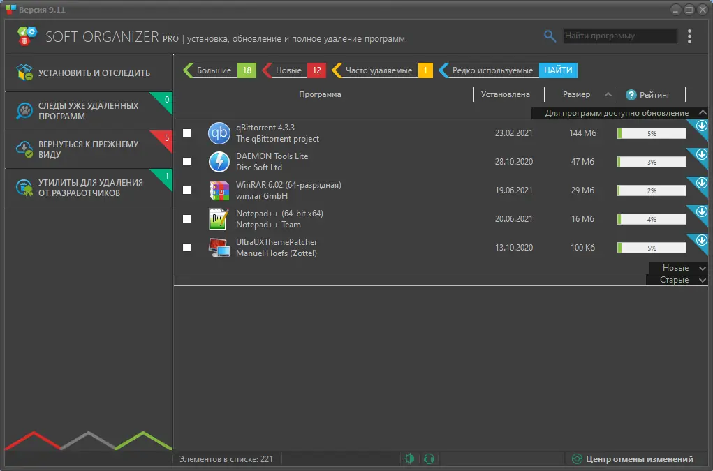 Soft Organizer — это инструмент для тщательного и полного удаления программ из операционной системы. Утилита отслеживает все изменения, вносимые при установке приложений, и обеспечивает чистое удаление без остатков в файловой системе и реестре. Подходит для пользователей, стремящихся поддерживать систему в порядке и избавляться от следов ненужного ПО.
