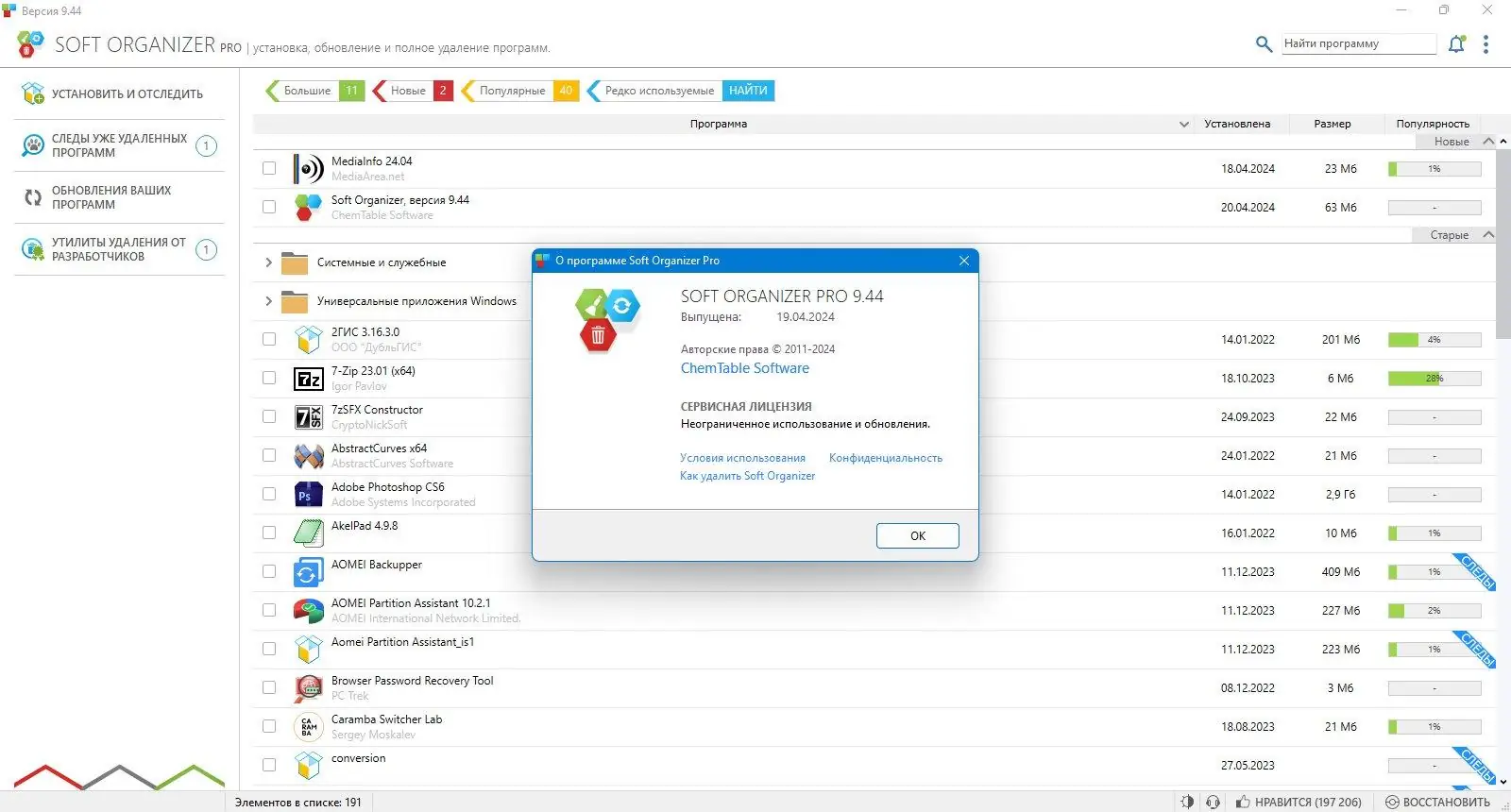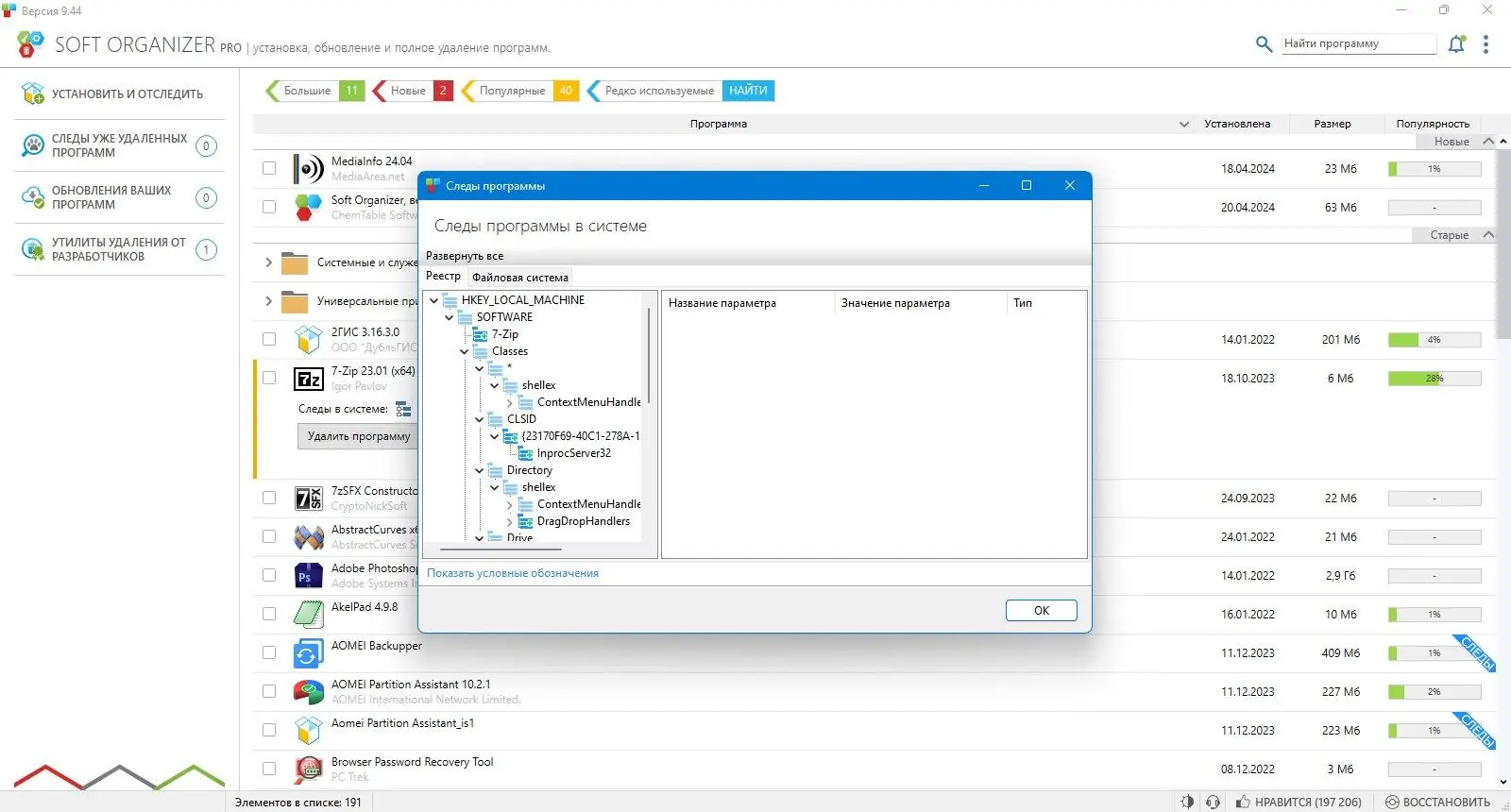 Soft Organizer — это утилита для полного удаления программ из операционной системы, способная очистить компьютер от остатков деинсталлированных приложений, включая файлы, папки и записи в реестре. В отличие от стандартных инструментов удаления, программа отслеживает все системные изменения, происходящие при установке, что позволяет в дальнейшем произвести тщательную и точную деинсталляцию. Решение идеально подходит для пользователей, стремящихся поддерживать систему в чистоте и высокой производительности.