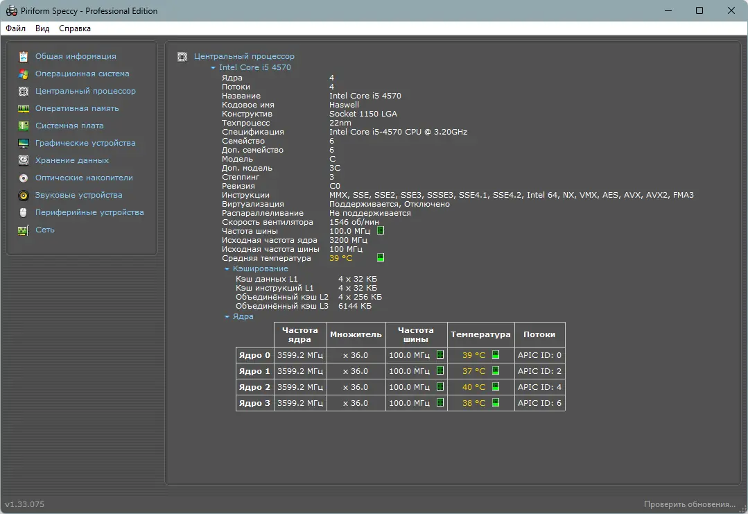 Использование Speccy не требует специальных навыков. После запуска приложение автоматически начинает анализ системы и отображает результаты в левой панели в виде дерева категорий. Каждый раздел — процессор, материнская плата, видеокарта, диски, память — можно открыть для просмотра расширенных данных. В главном окне отражаются как базовые параметры, так и продвинутые метрики, такие как скорость шины, температура ядер и загрузка компонентов. Для экспорта информации доступна функция сохранения отчёта в текстовом формате, что удобно при обращении в техническую поддержку или при подготовке к апгрейду.